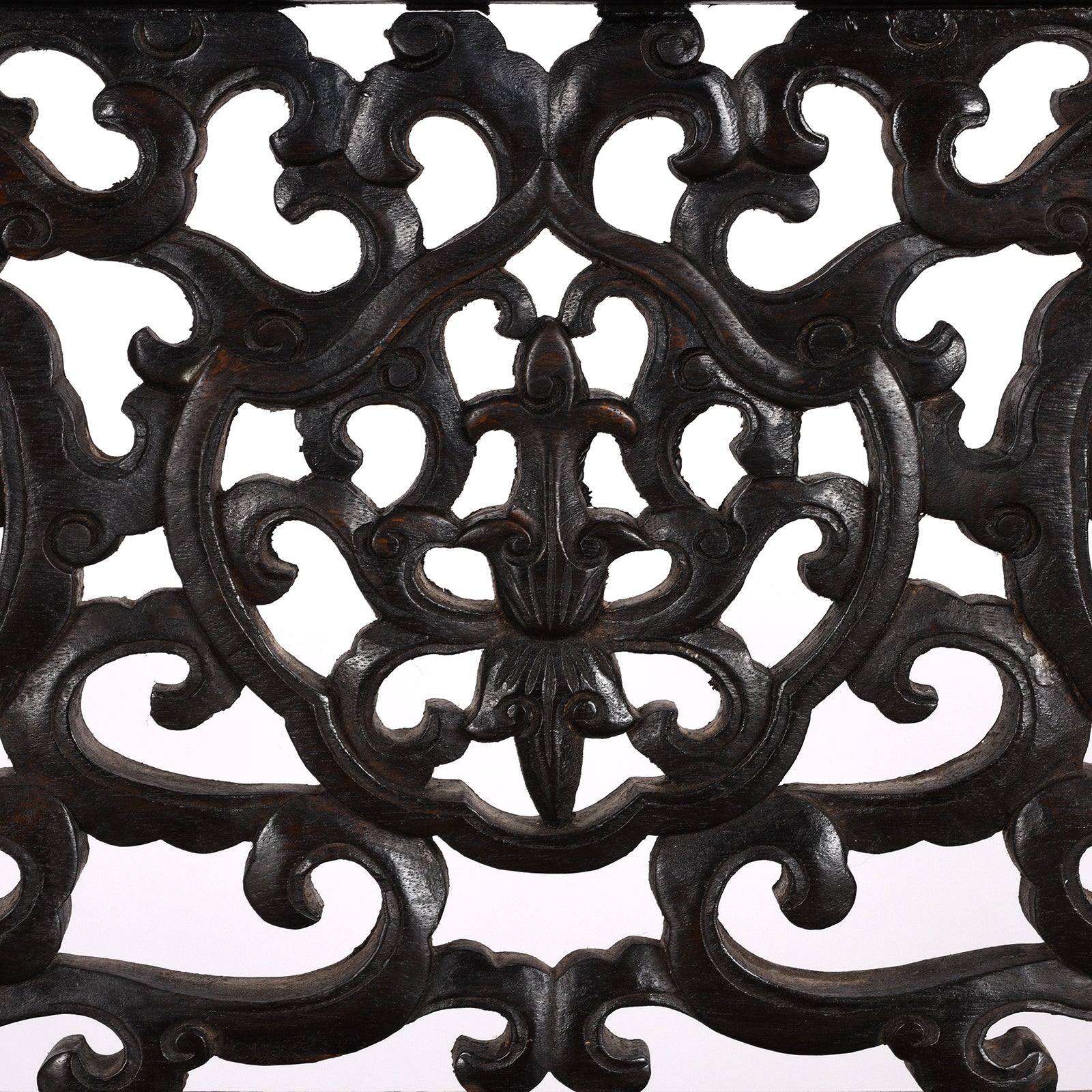 This antique Chinese bench was made by a master craftsman at the end of the Qing dynasty. It's a beautiful inception and gracefully merges the Ming & Qing styles.  With carved and pierced panels decorated with stylised baoxiang hua in an ogival with the classical hornless Chi dragon with the foliate tail on both sides.