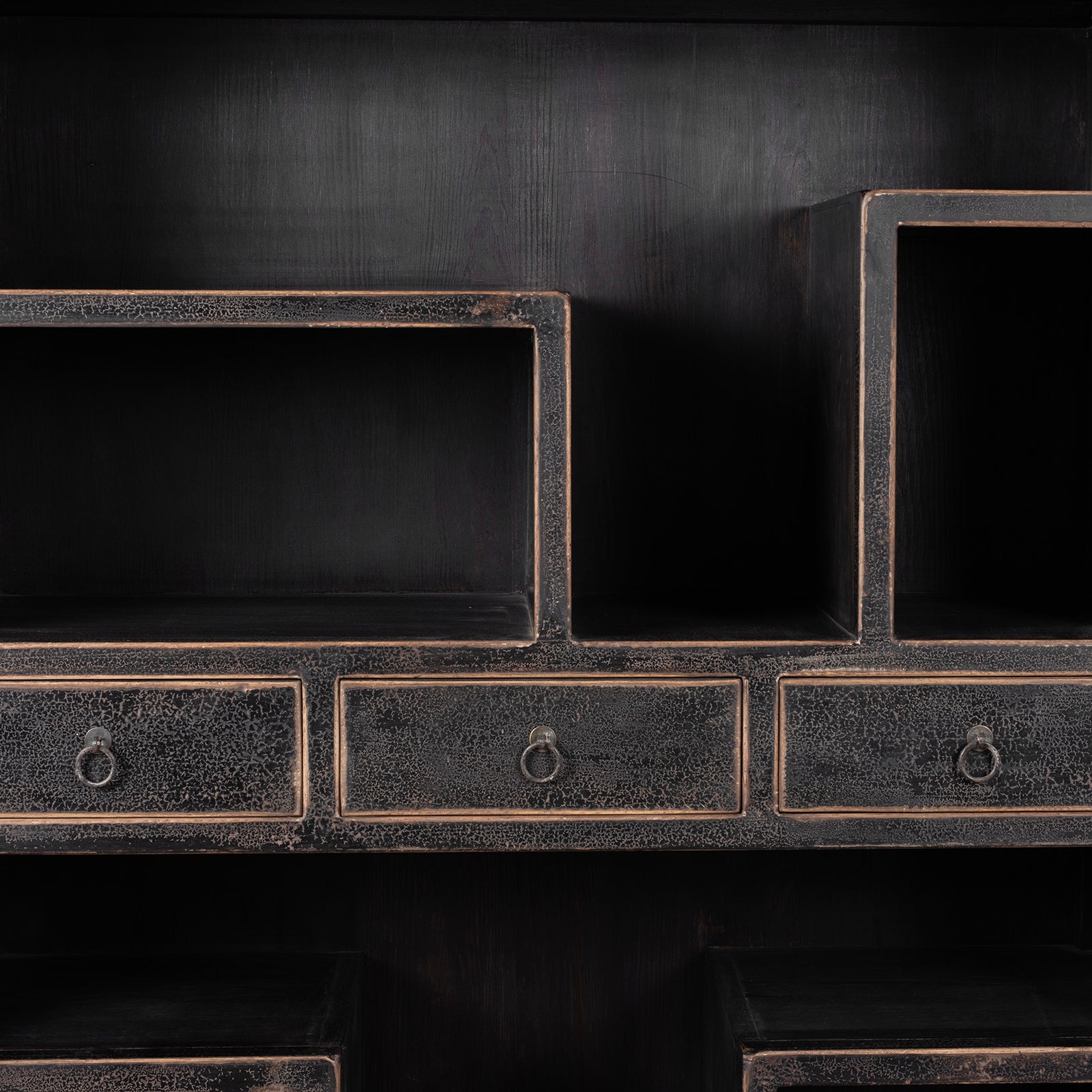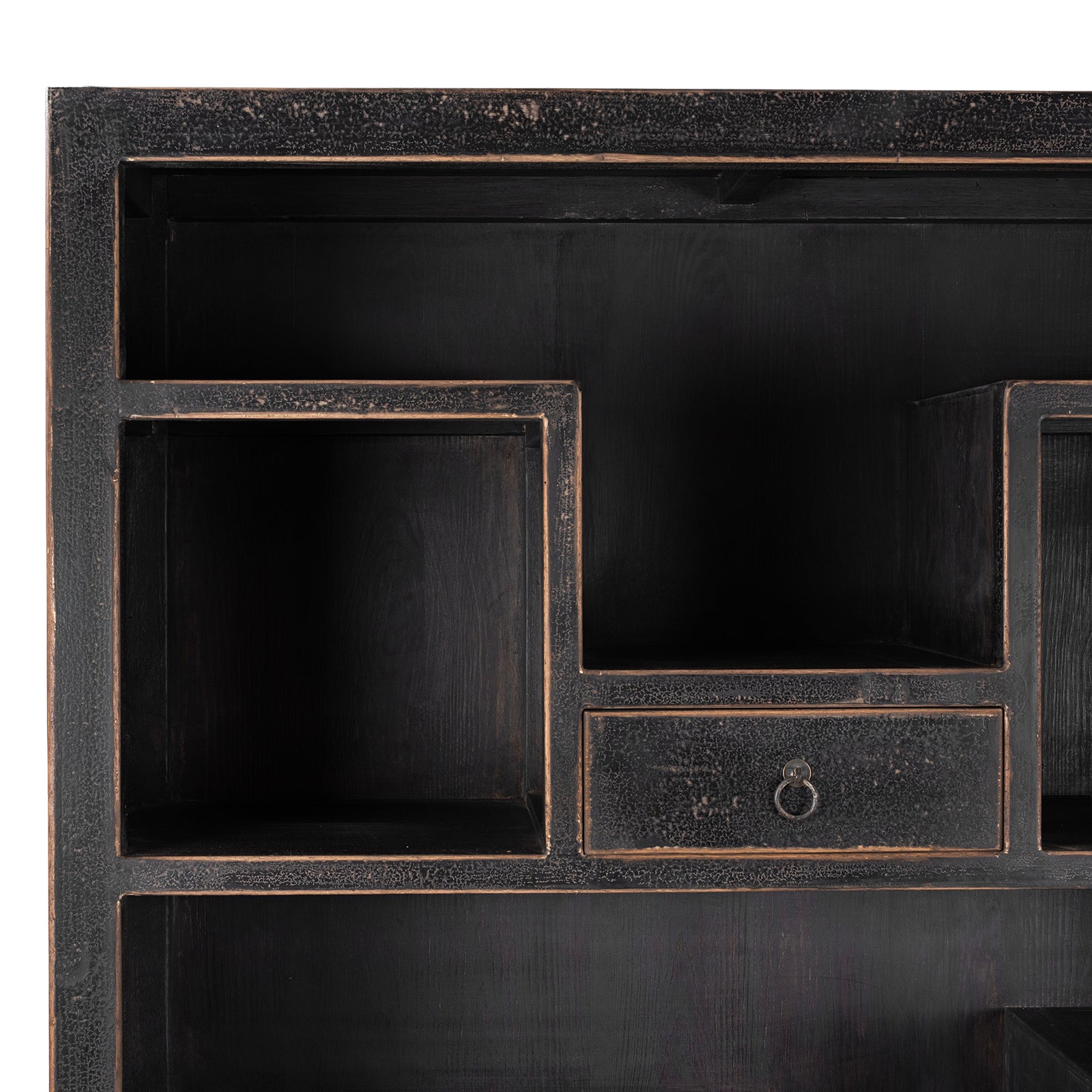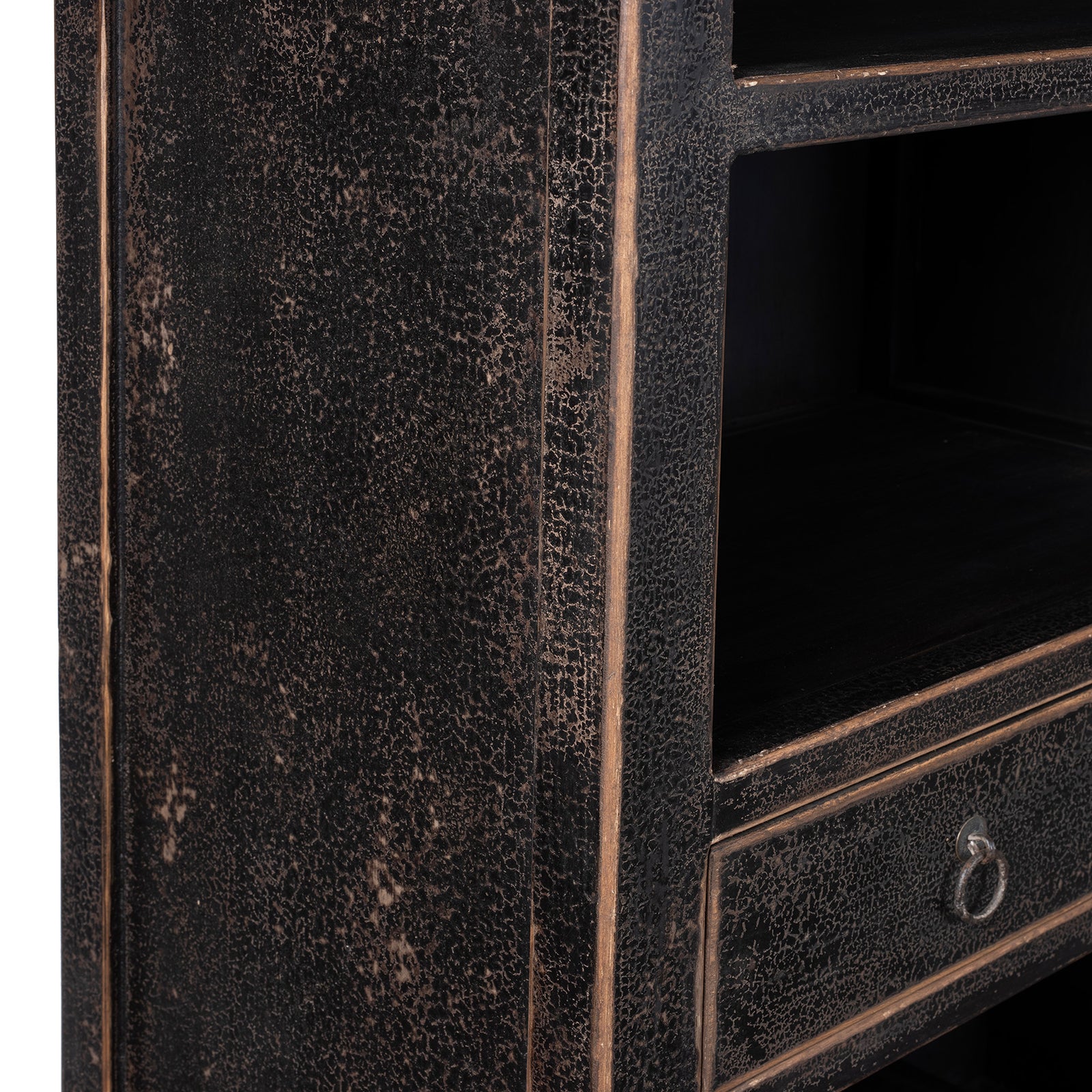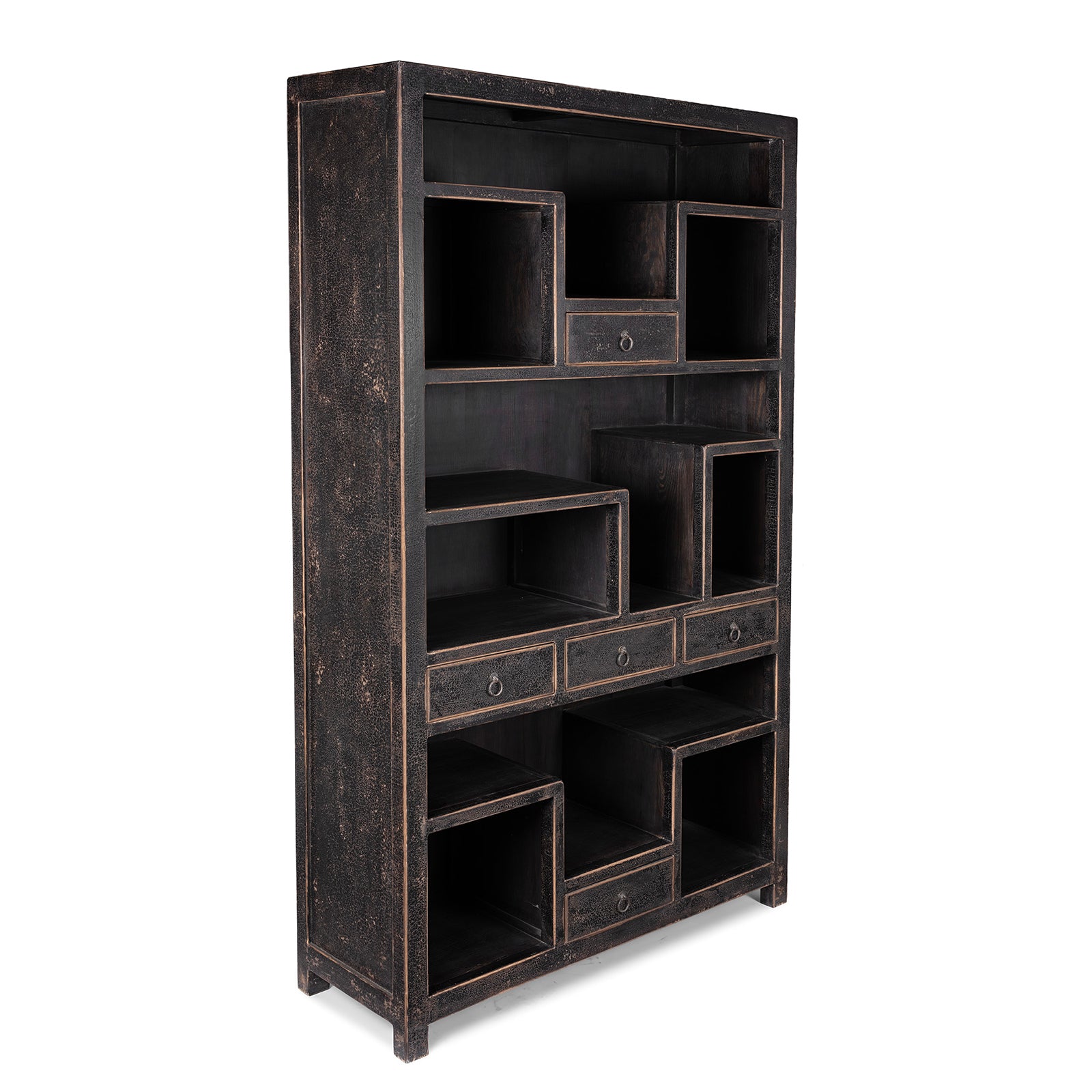 Crafted from reclaimed pine wood salvaged from old Chinese doors and floors, this piece blends modern design with an antique sensibility. The distressed black paint finish enhances its character, highlighting the natural aged texture of the wood while giving it a contemporary edge.