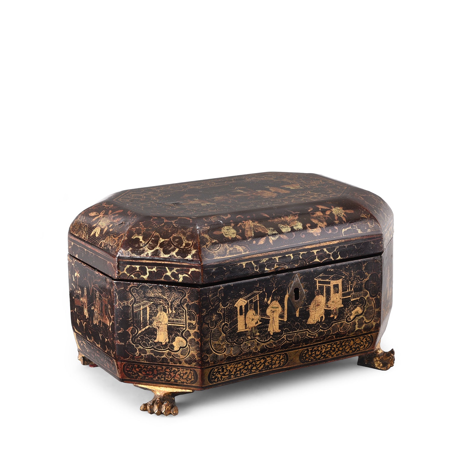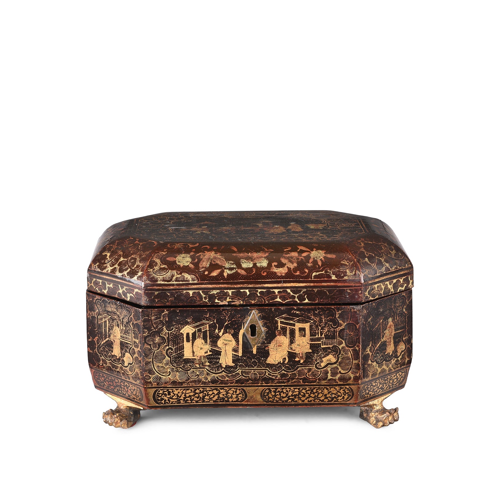 This gilt Chinese Export tea caddy was made in the middle of the 19th century for wealthy members of the British Georgian upper class in the Qing dynasty. Tea caddies were particularly in fashion for wealthy members of high society who wanted to store their valuable and exotic teas. The detailed gilt black lacquer work was made using the maki-e technique and required a high level of technical skill. Tea caddies were often gifts from traders and merchants who traveled to China & the Far East to make their fortunes.