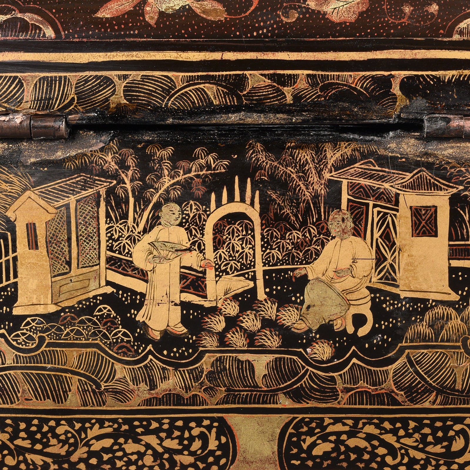 This intricate and detailed work was made for export to Britain when Chinoiserie was all the rage. Black lacquer export sewing kits and games boxes were also made.