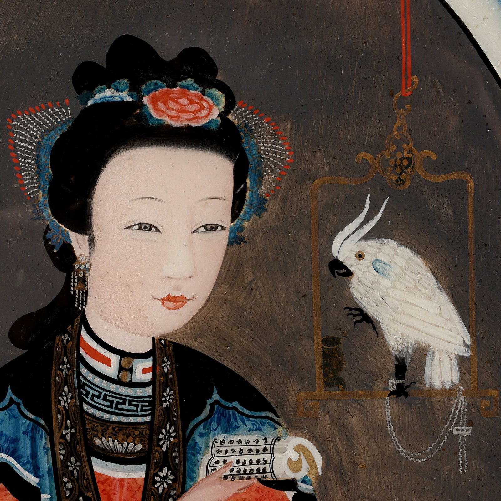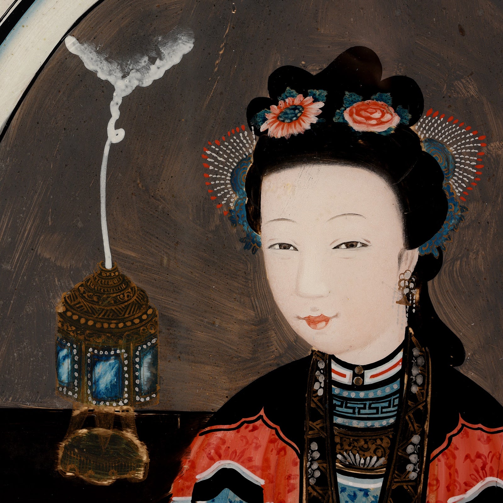 Face Detail From Antique Pair of Framed Reverse Glass Paintings | Indigo Antiques
