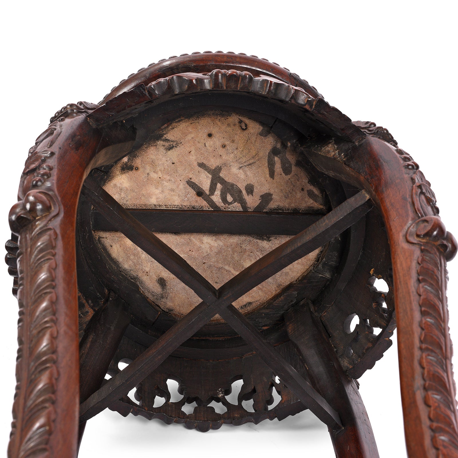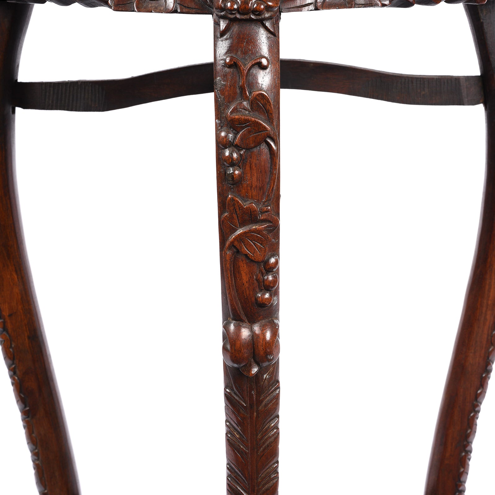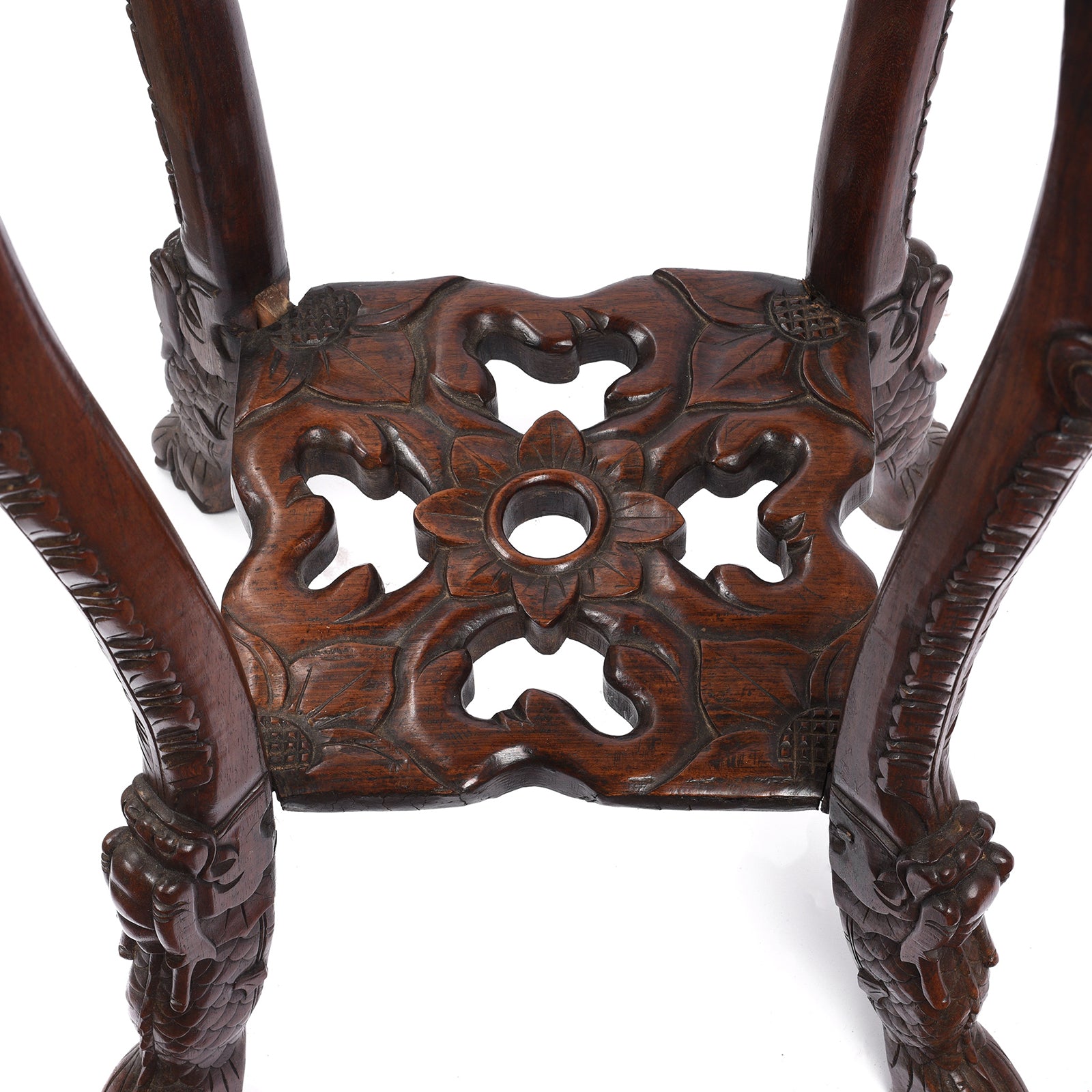 This elegant jardinière stand was constructed in the late Qing dynasty - circa 1880 in Canton. Its four sturdy legs are beautifully carved with fruiting vines and support the top which has a round marble inset, making it perfect for a potted plant or lamp.