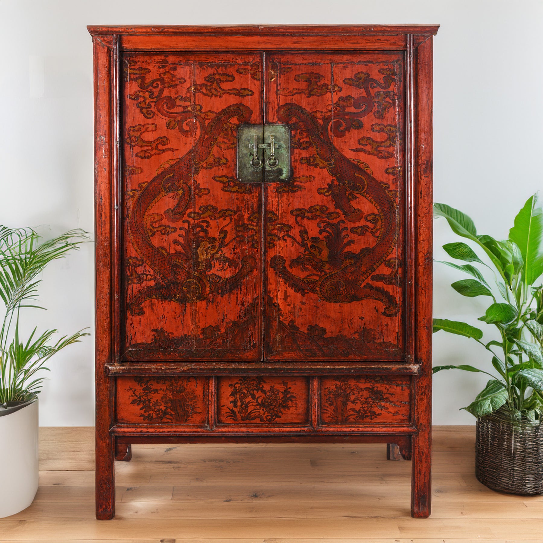 Antique Gilt Chinese Red Lacquer Chilong Dragon Wedding Cabinet | Indigo Antiques