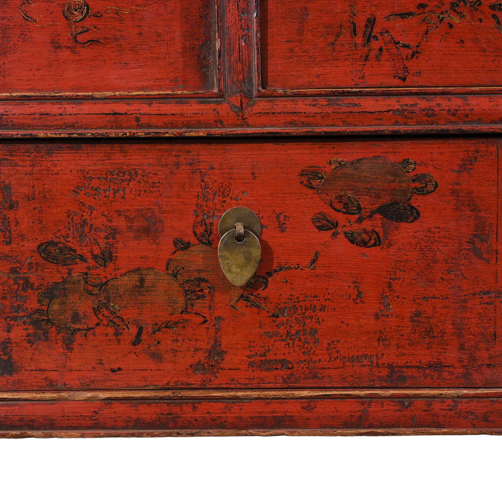 This exceptionally good quality antique Chinese red lacquer wedding cabinet is from Shanxi province, dating to the early 19th century - Qing dynasty (1644 - 1911). The tone is the perfect 'Peking red'. The red lacquer work on this cabinet is original and features gilt scenes of a rural Chinese town. Lacquer cabinets were often given as wedding gifts, often in pairs. Better quality cabinets like this one are made from elm.