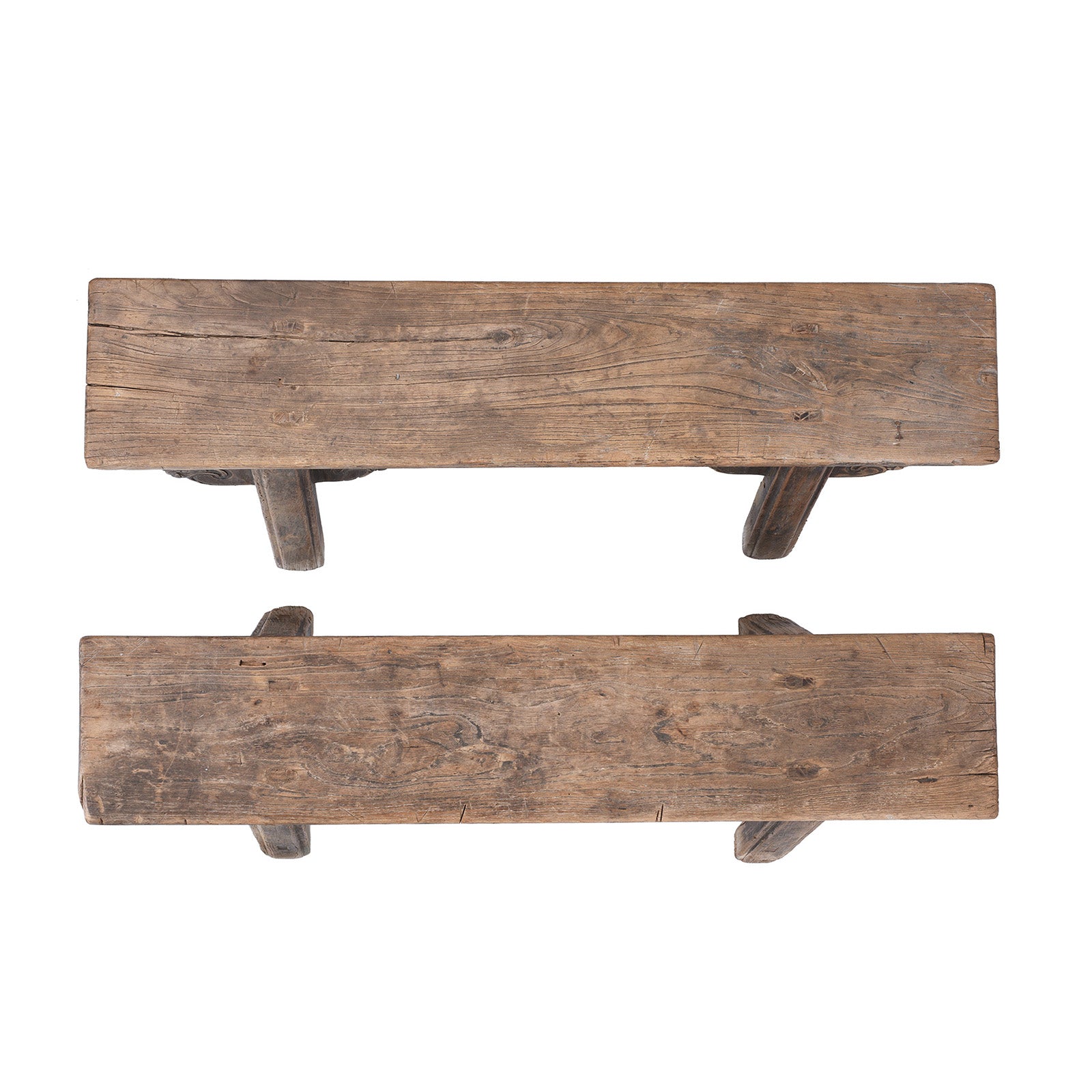 Constructed from solid elm, each bench features beautifully carved cloud motifs to the shaped brackets beneath the seat, a decorative detail that softens the otherwise simple, functional form. The rich, dark patina and worn seat surface reflect decades of use, giving the timber depth and character that only time can create. The legs are splayed, as is typical of this regional style, providing both stability and a distinctive silhouette.