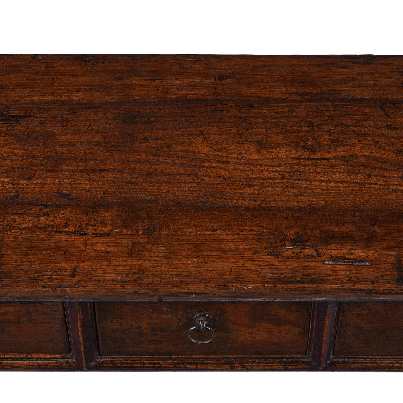 The design remains understated and functional, with a narrow console profile and three generously sized drawers fitted with simple metal ring pulls. The top shows honest wear consistent with age, contributing to the piece’s authenticity rather than detracting from it. In traditional Chinese interiors, tables of this type were highly versatile, used for everyday domestic tasks as well as more formal or ceremonial purposes.