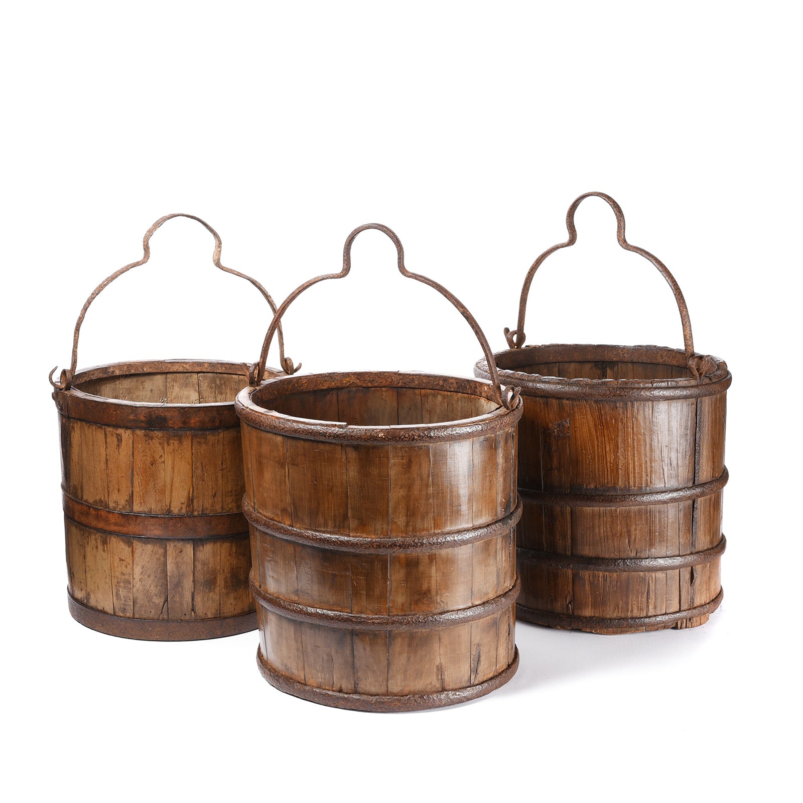 These old water buckets are made from cypress wood with iron coopering. Whilst these can be found in various provinces of China, these particular buckets were made in Shandong province during the 19th century. It would look perfect with a few logs in or can be used as a planter with a plastic liner (not supplied).