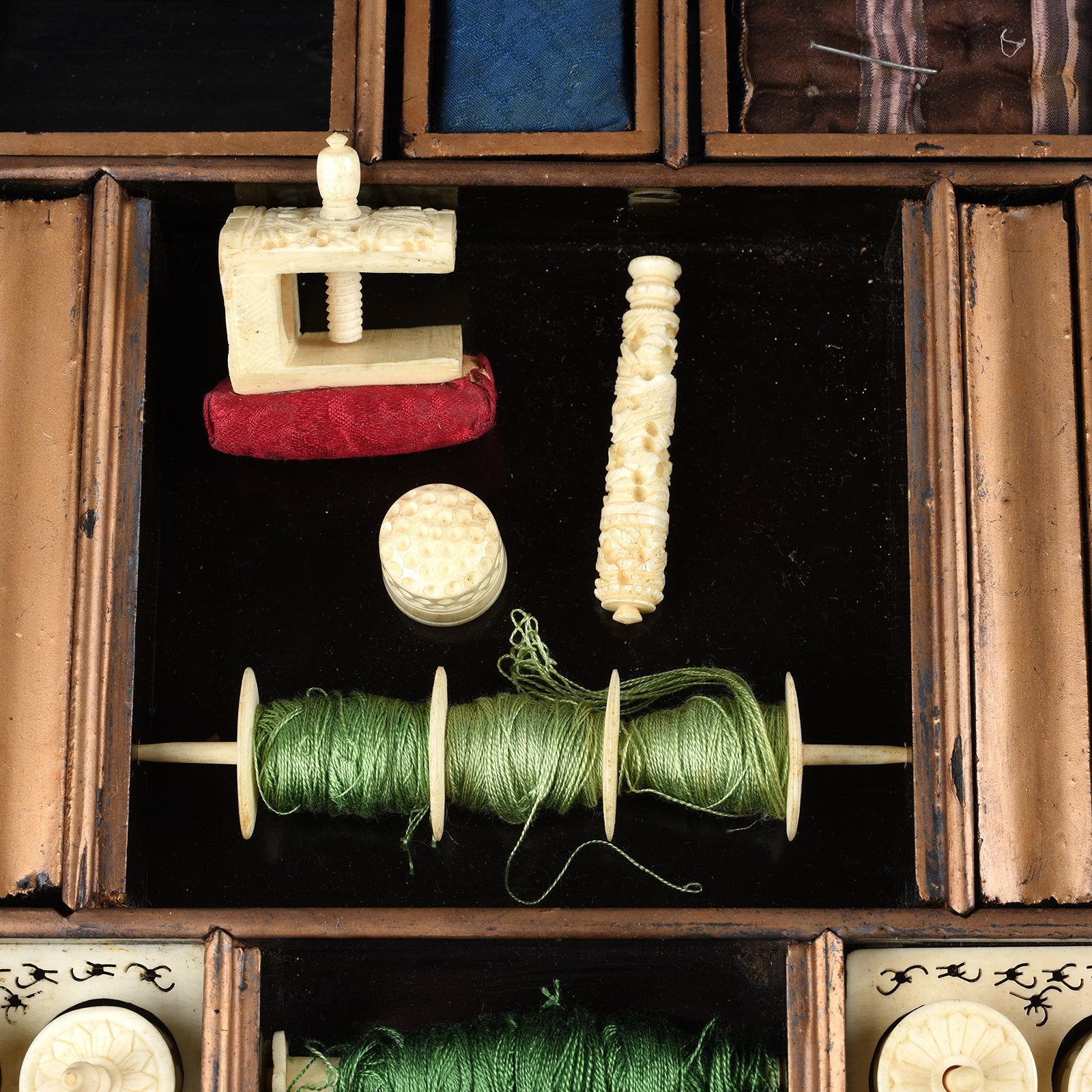 These pieces are fragile pieces of history and are usually found damaged, especially the tops, however, the condition of this piece is outstanding. This sewing box has been checked over in our workshop and small restorations made to stop the aging process.