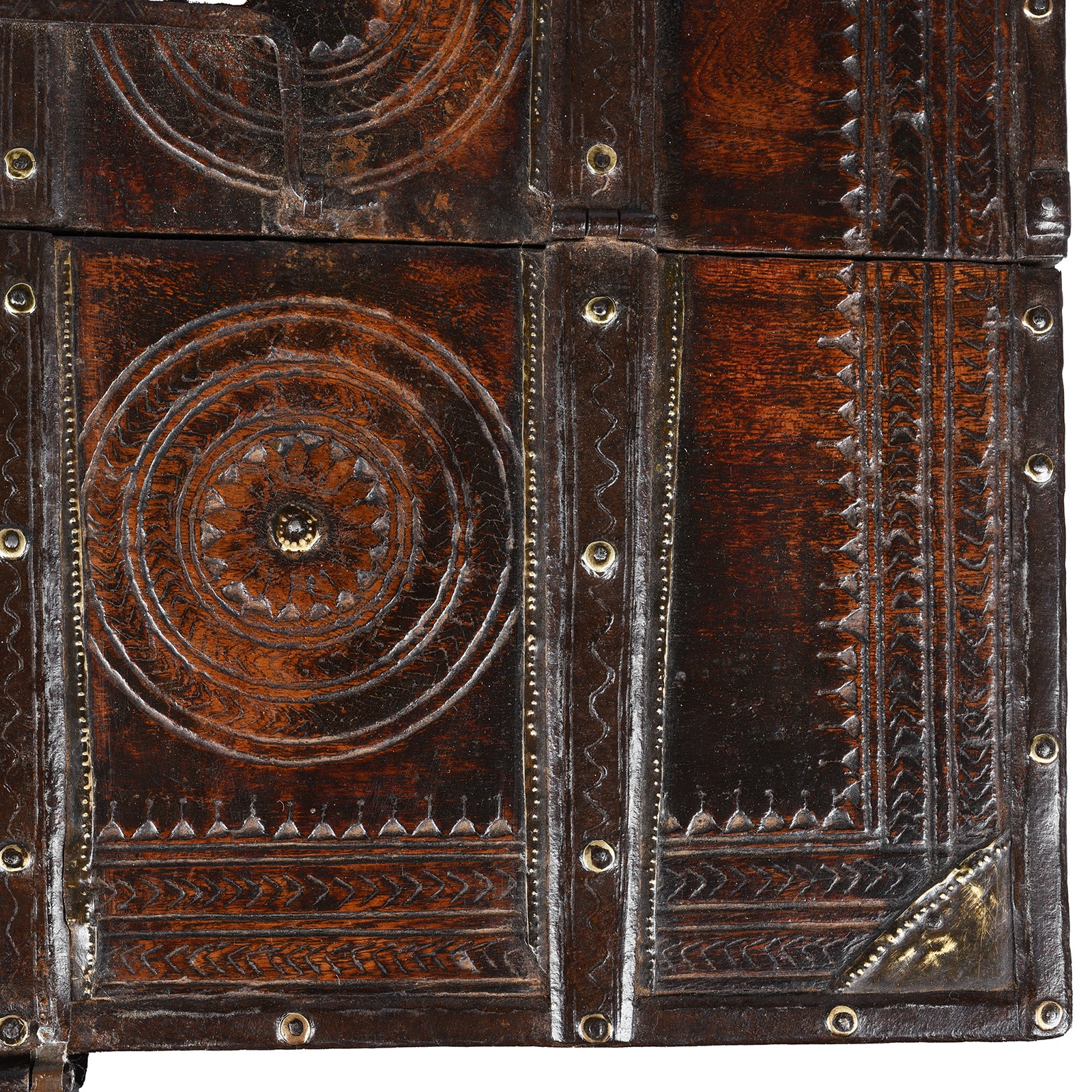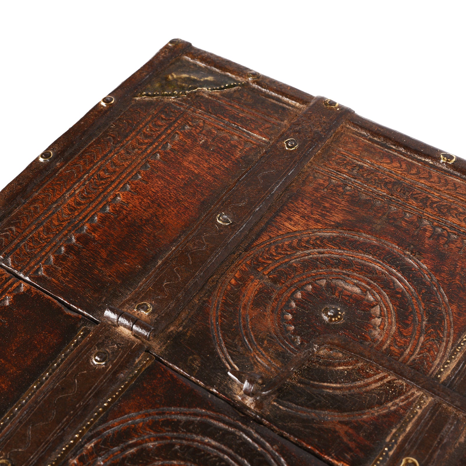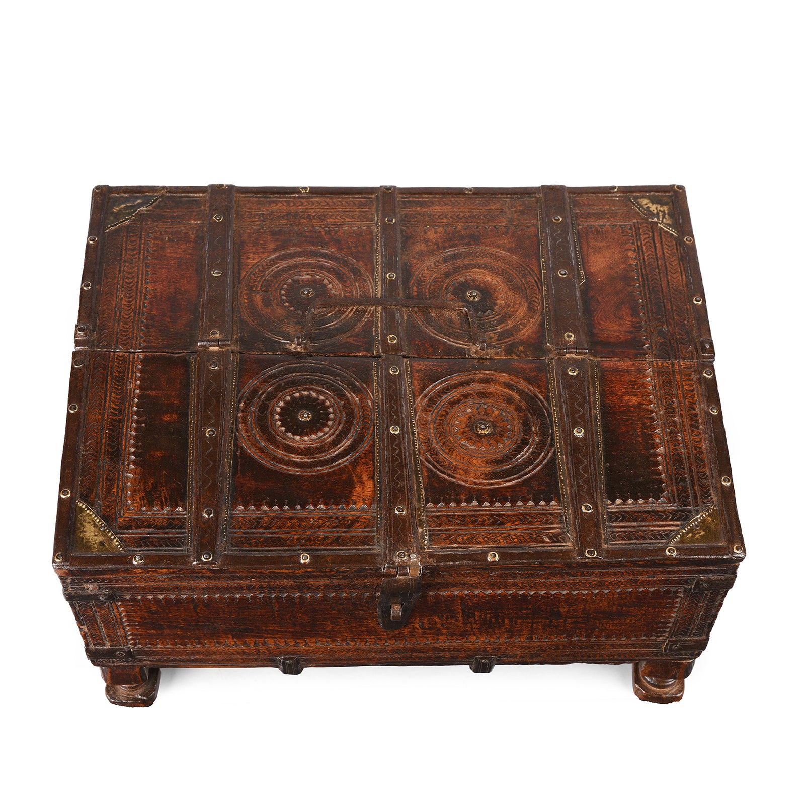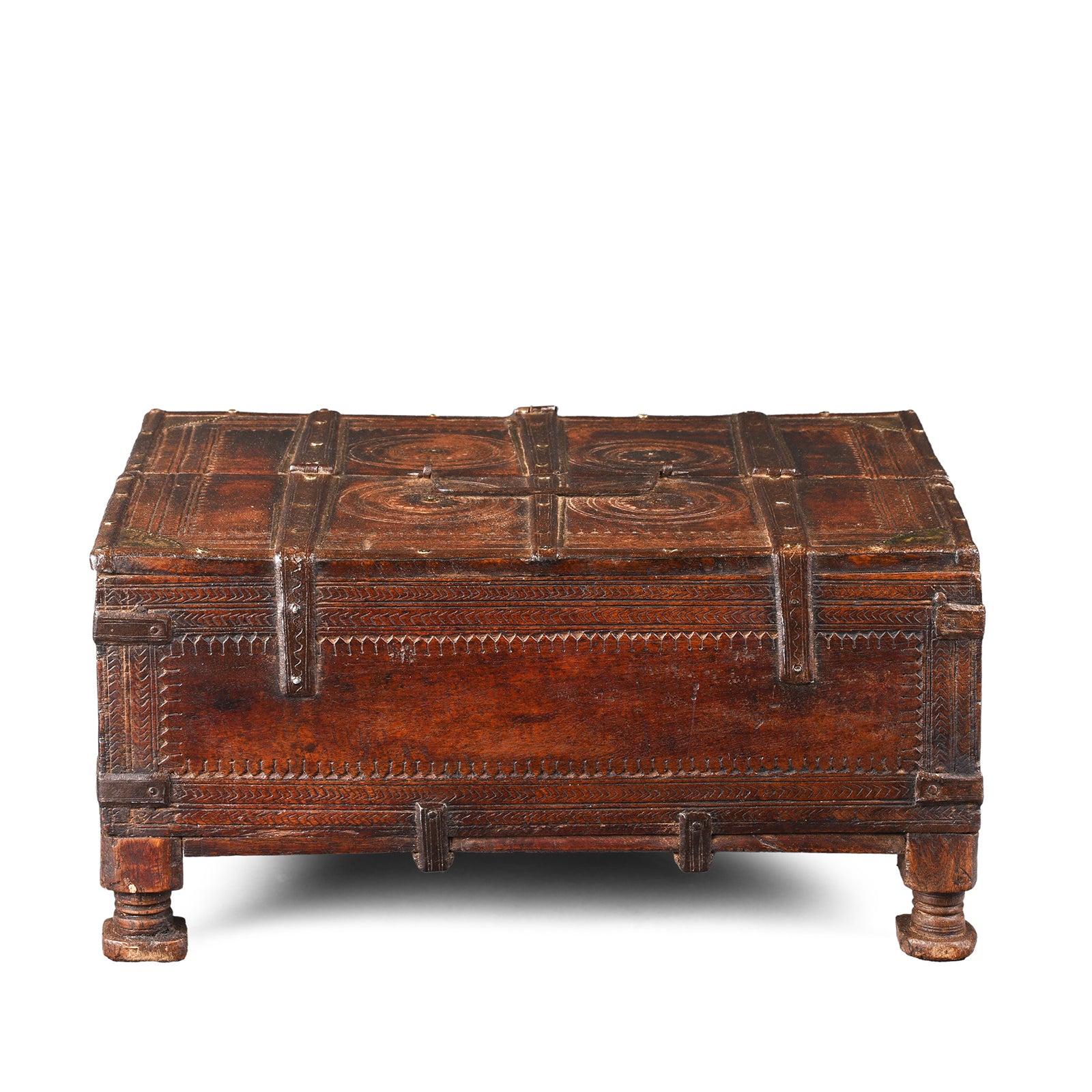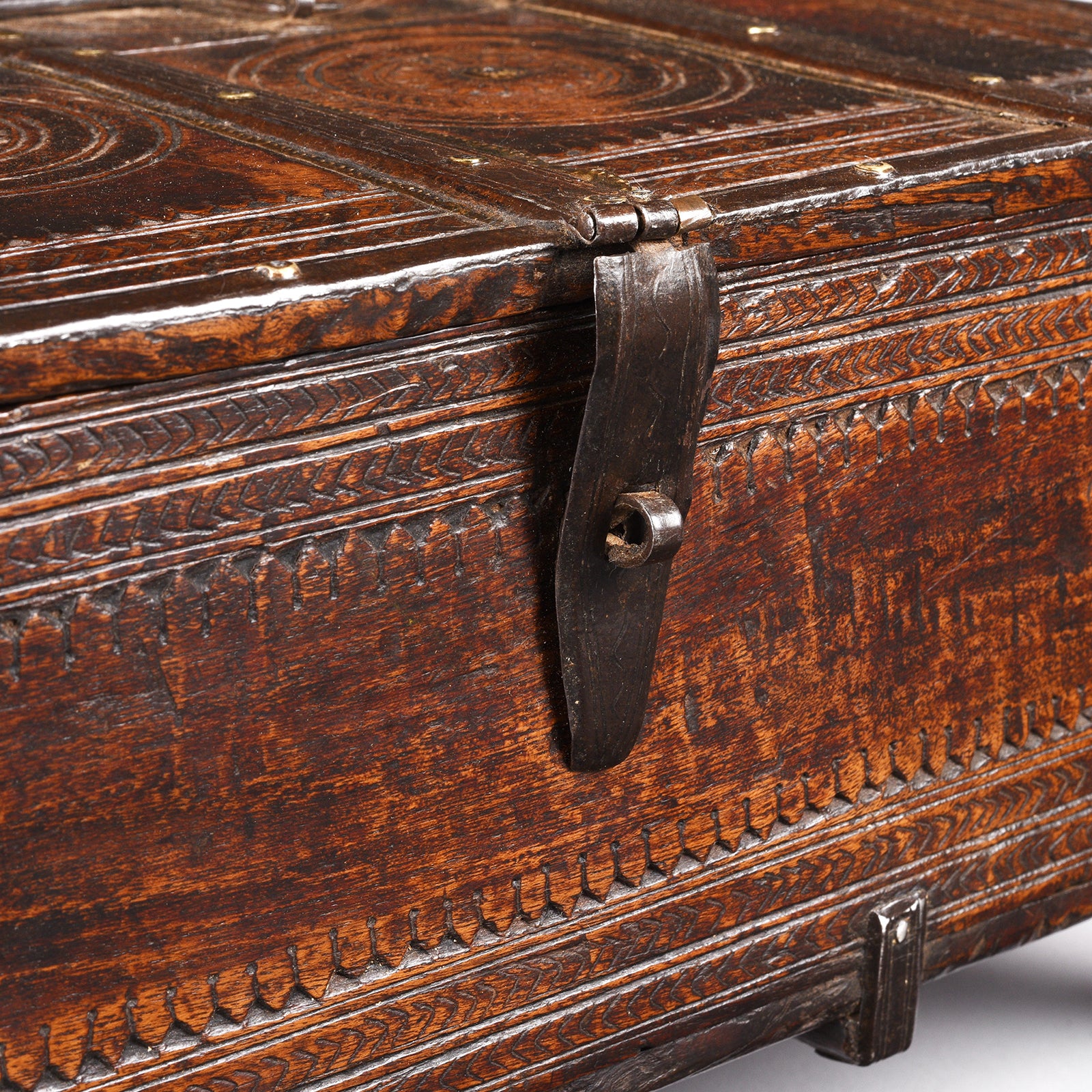 This lovely chip-carved antique Indian box is from Northern Rajasthan and has the original ironwork. It is made from roheda wood and dates to the 19th century. These boxes were used in the old days by merchants and traders in the bazaars for storing their cash and ledgers. They were also used by Indian families for the dowry of their daughters, as a trousseau.