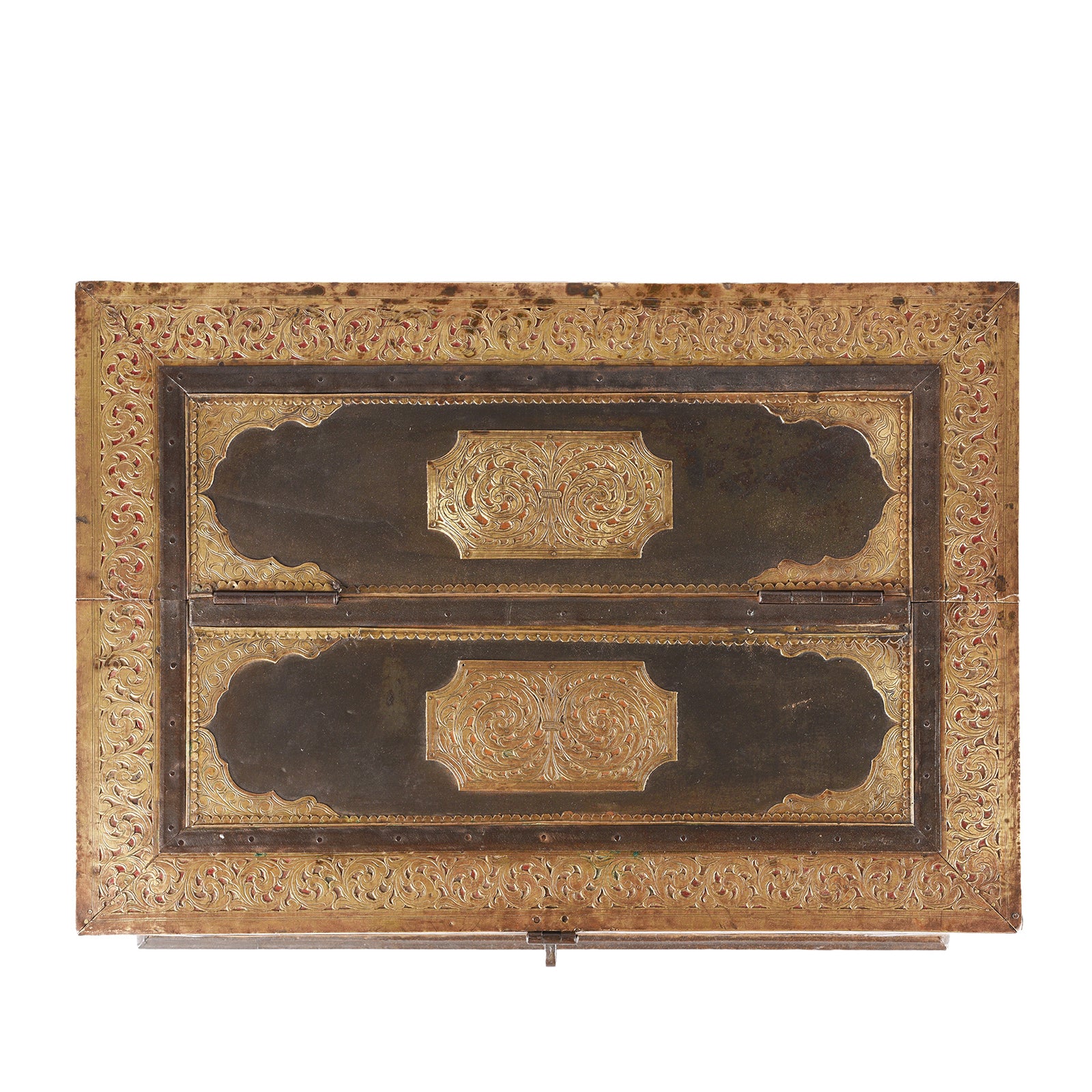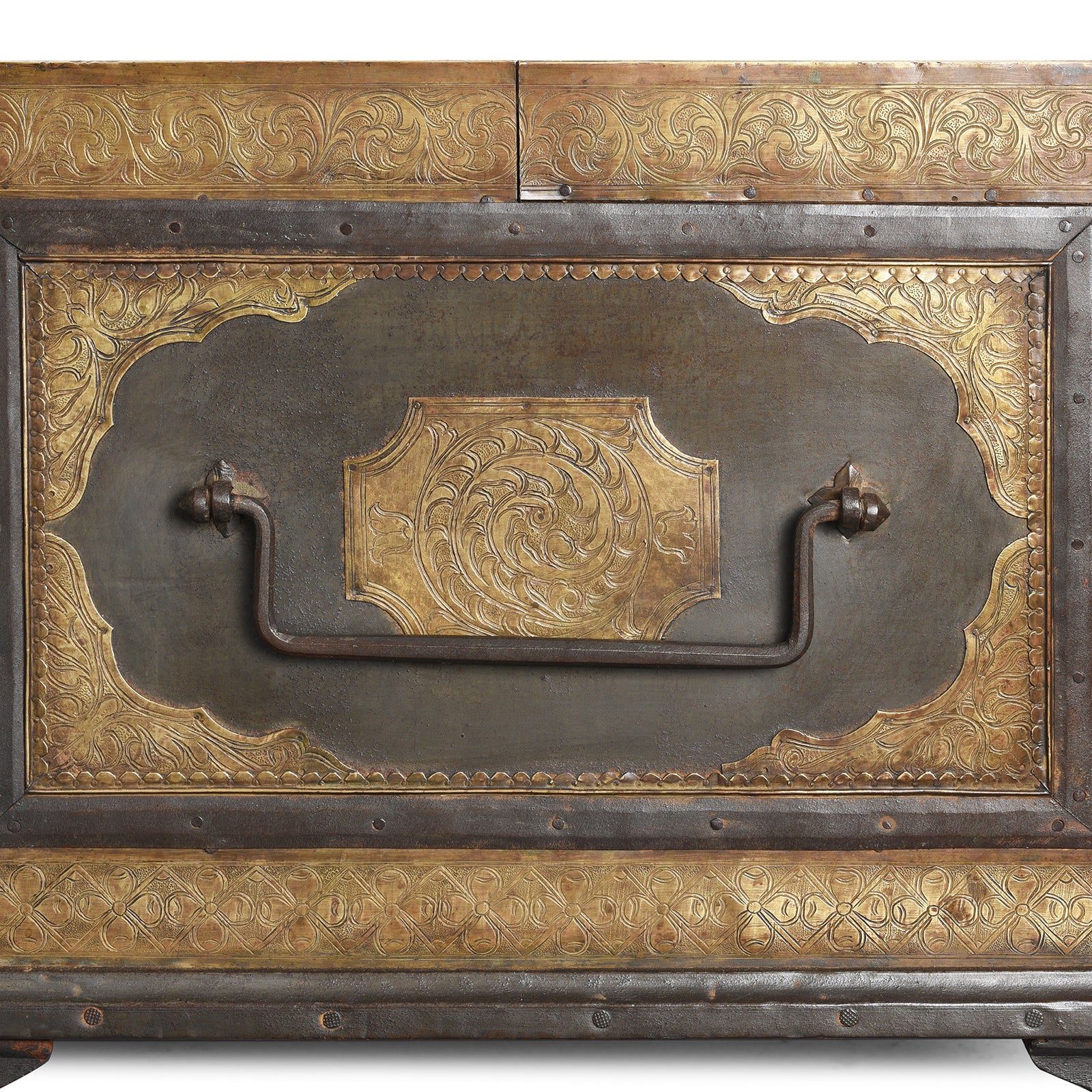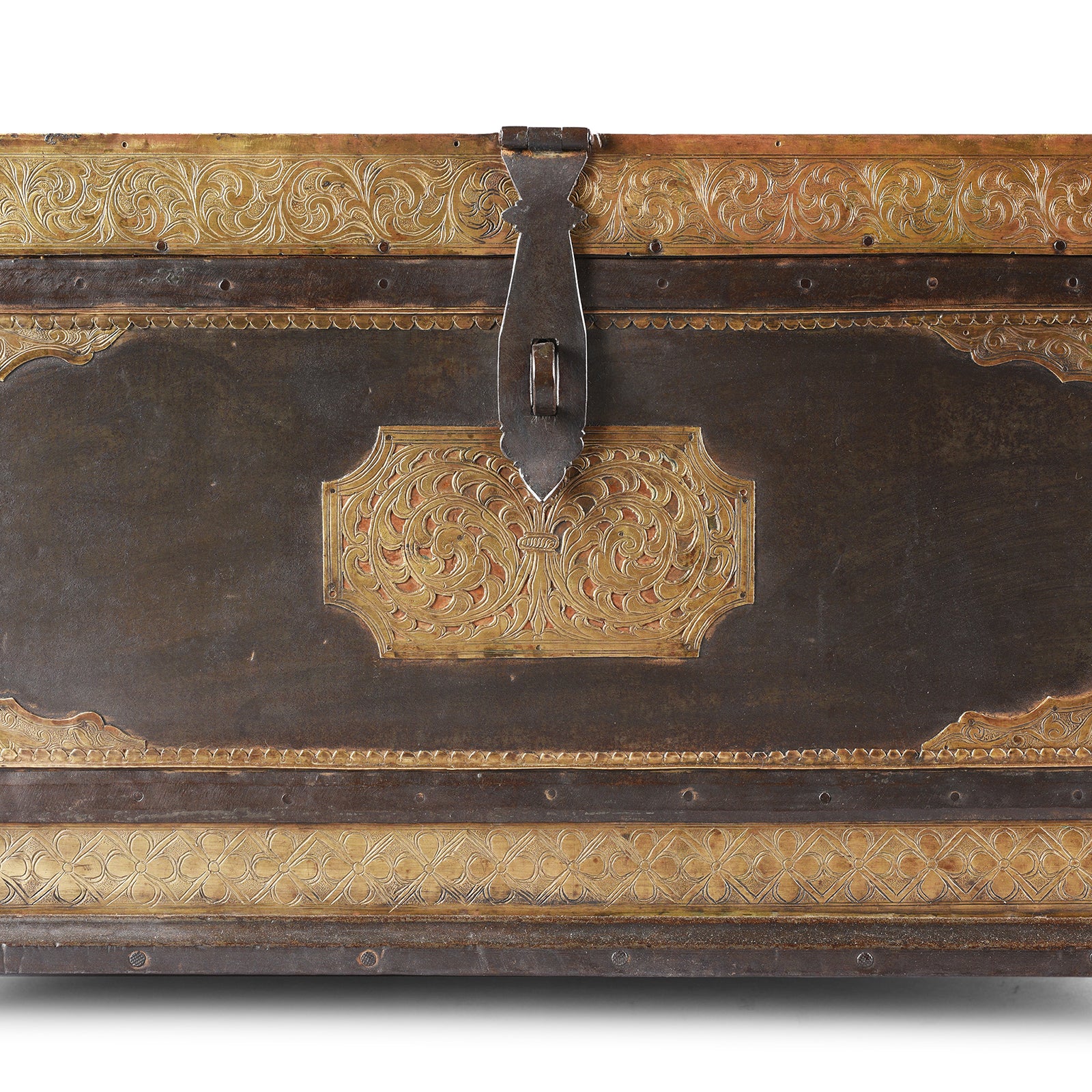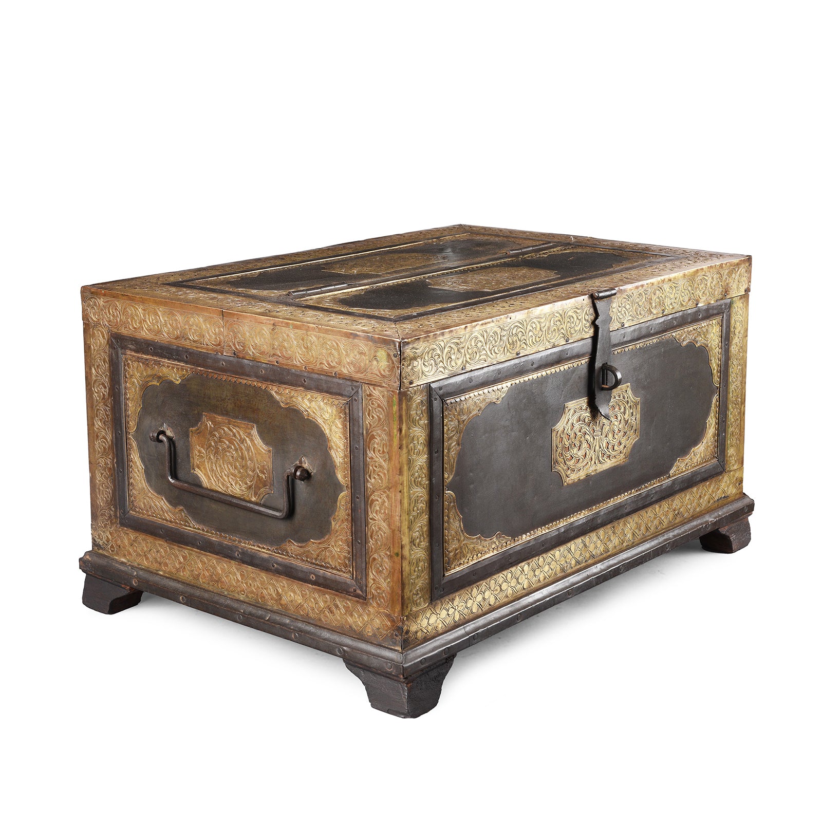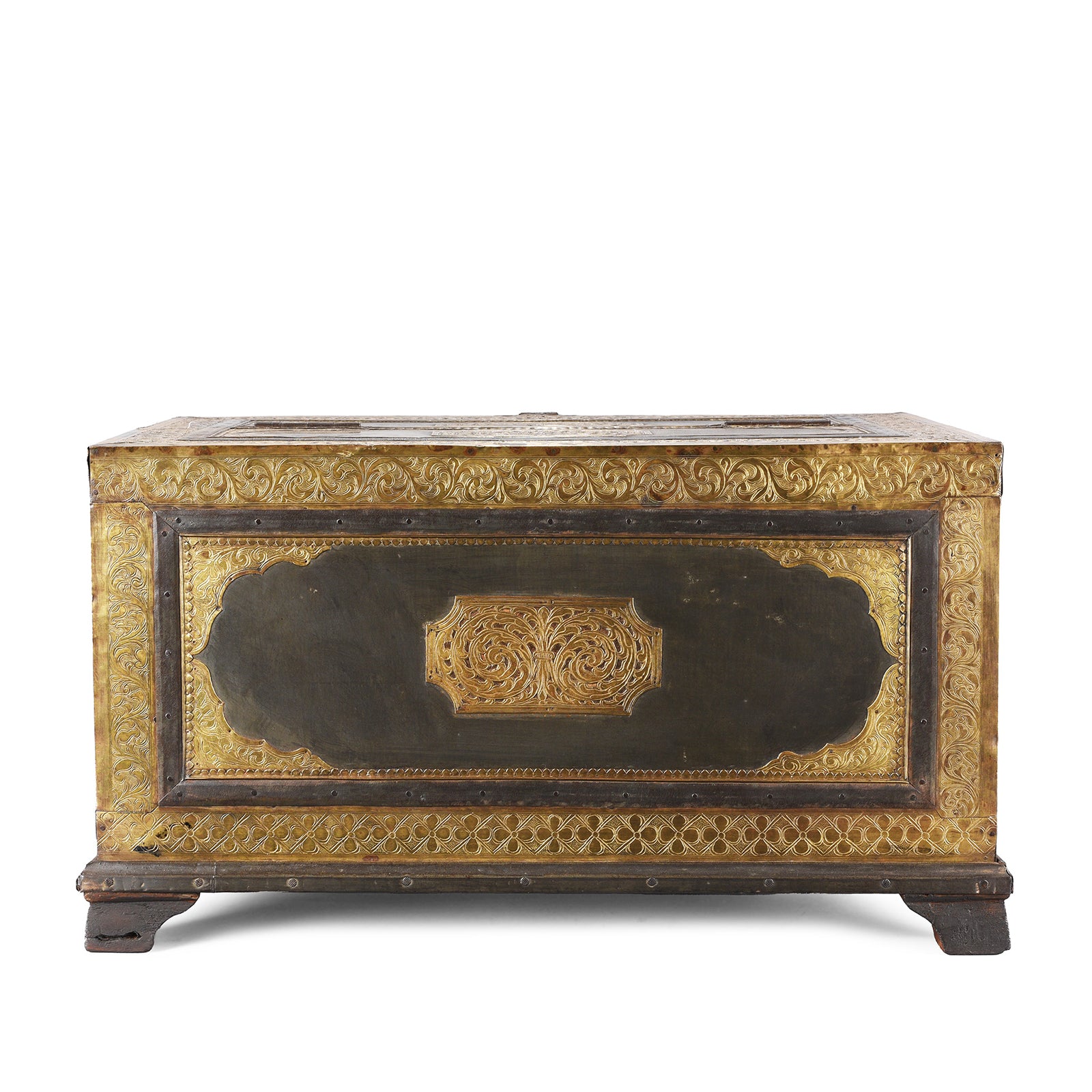This Indian antique etched brass box is from Shekhawati and is one of the best examples of a Shekhawati trousseau box we've found and dates to the 19th century. These boxes are locally called peti (casket) and were originally used to store the trousseau (bridal clothes & jewellery). Each box is lined with fabric to safeguard the expensive contents. The body of the box is constructed from roheda wood which is clad with iron and brass. This worked, hand beaten, etched and chased work is referred to as chithai work and depicts a trailing acanthus flower.