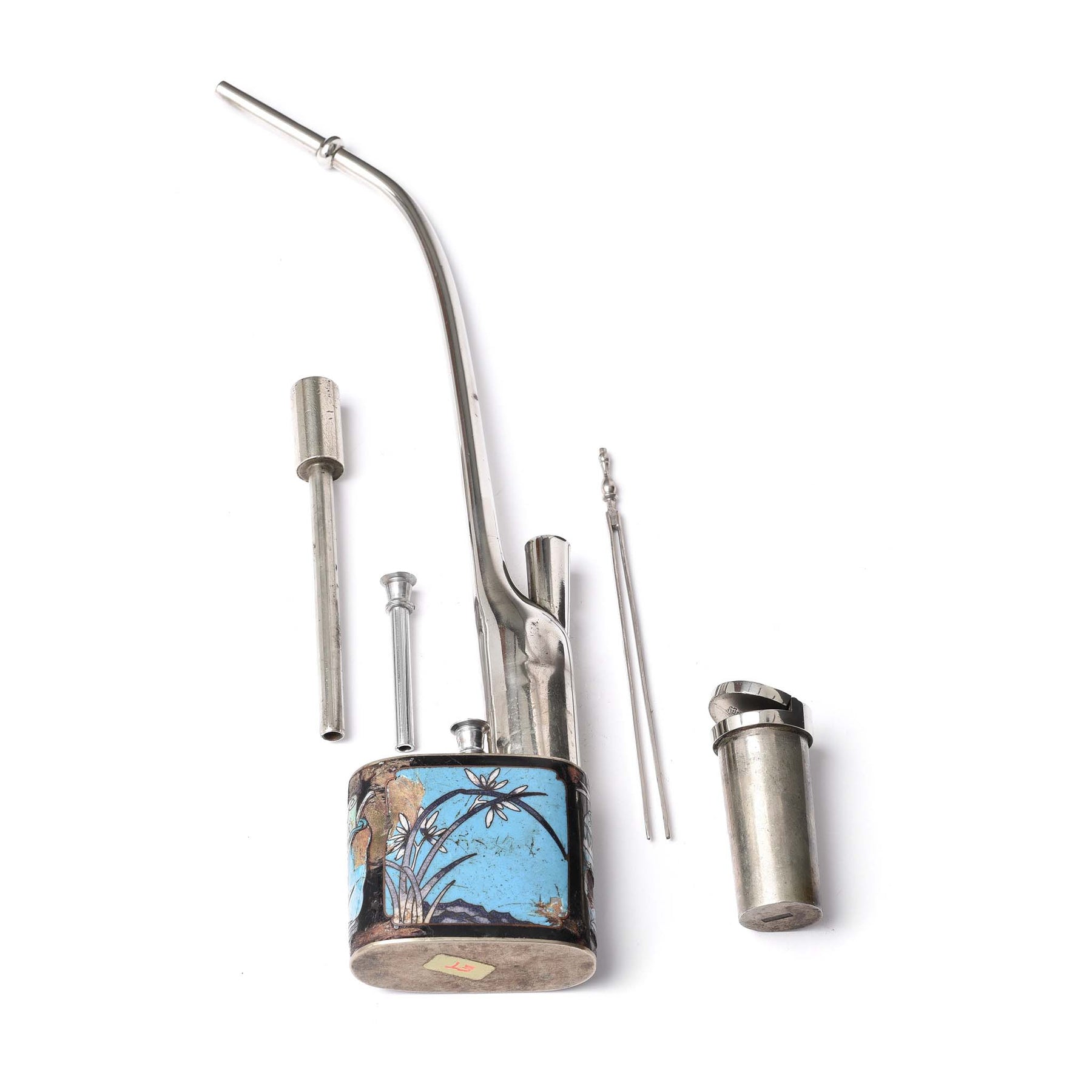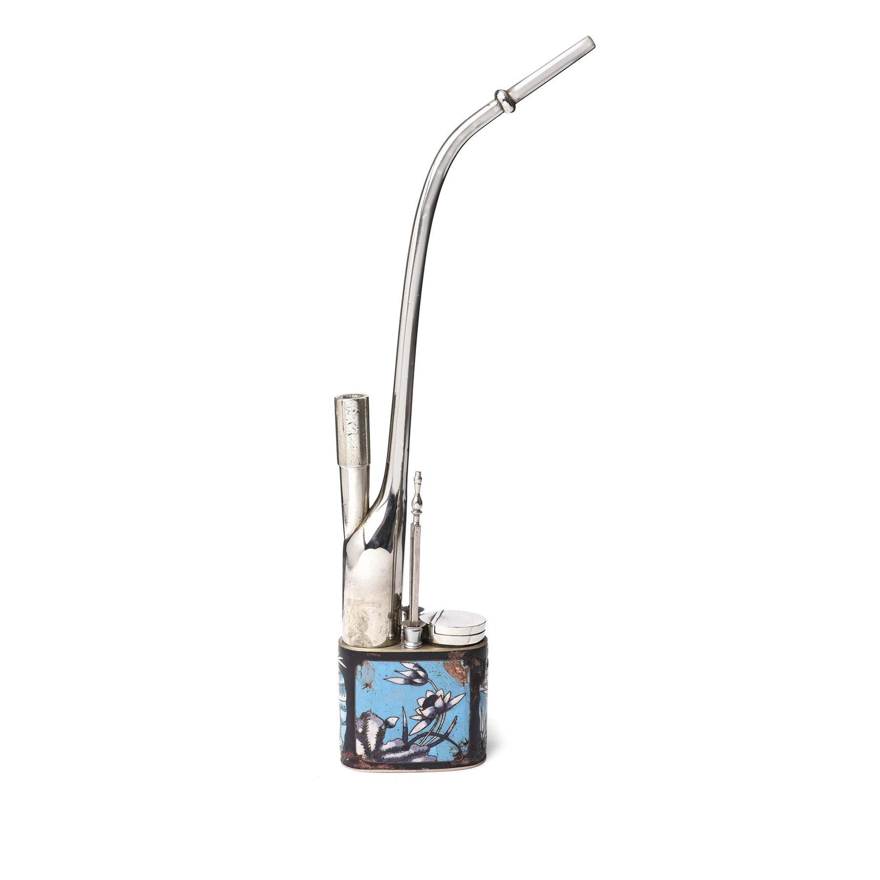 This antique Chinese cloisonne & paktong water pipe would have been used to smoke tobacco & opium. It is constructed from a copper, zinc, and nickel alloy called paktong and has cloisonne work depicting floral scenes and dates to the 1900's. Heated opium or tobacco would be placed in the lidded well of this ornate water pipe and the fumes were inhaled through the pipe