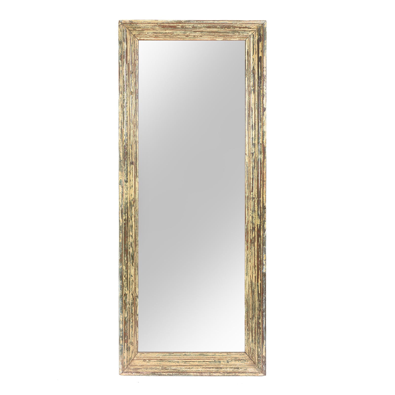 This mirror is made from an old Indian 19th century window frame from a building in Gujarat. Layers of the original green and cream paints can still be seen.