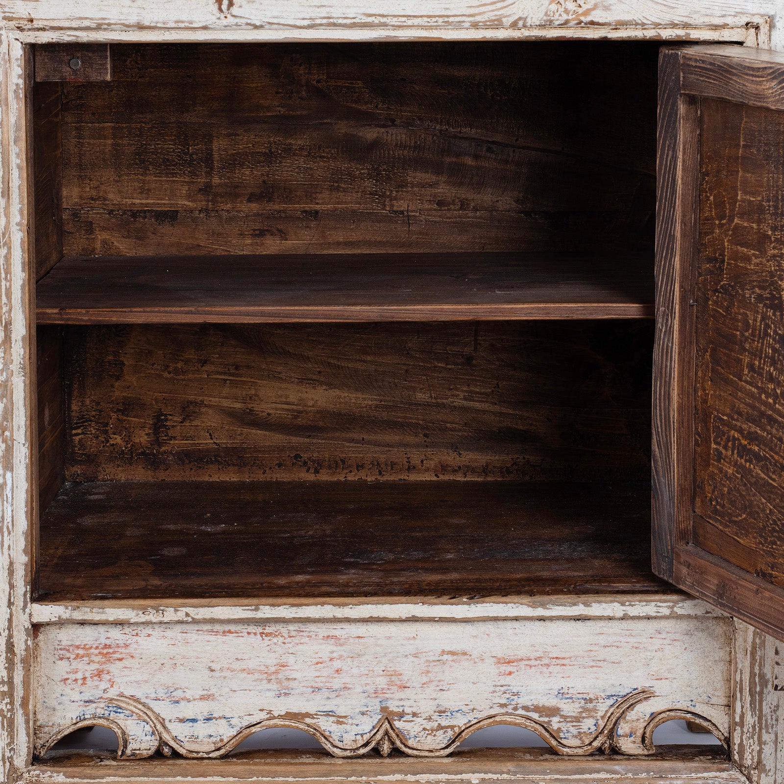 Originally designed as a top-opening storage chest, this piece has been sensitively modified with front-opening doors to make it more practical for modern use. The interior is divided into three compartments, each fitted with removable shelves, offering flexible storage options.