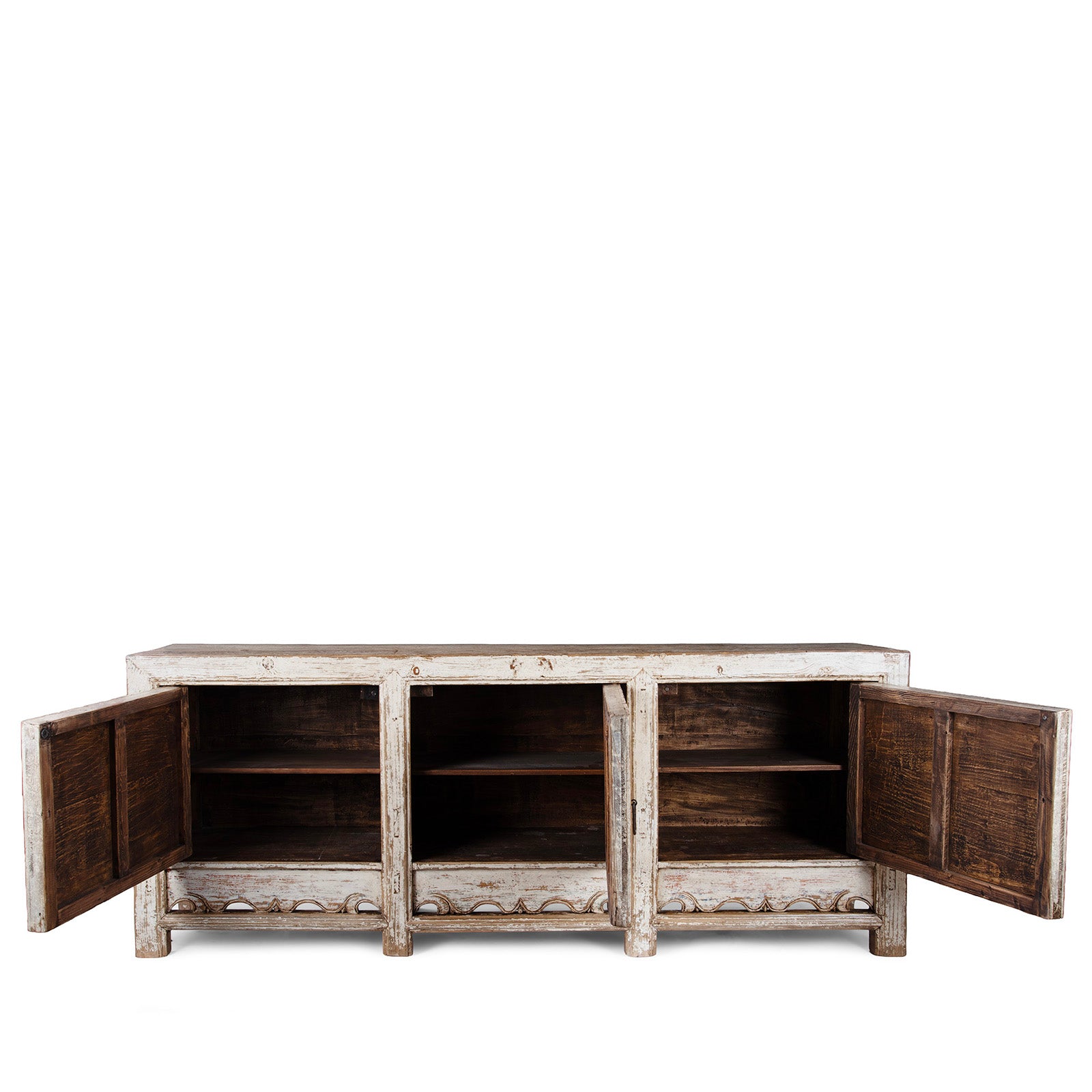 This beautifully weathered cream-painted sideboard originates from Qinghai province and dates to the 19th century. Traditionally used by nomadic communities, cabinets of this type served multiple roles, including the storage of clothing, bedding, and grain, as well as functioning as altar cabinets for family ancestor worship.