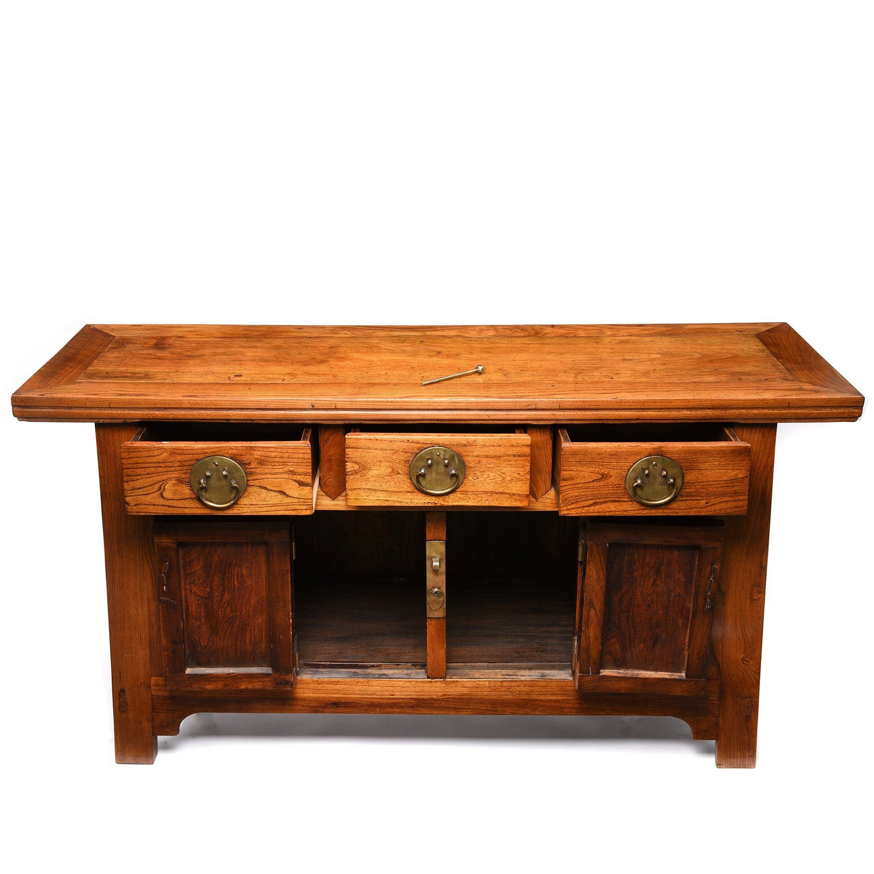 These Chinese sideboards were used for storage & also as altar cabinets for family ancestor worship and were usually made from elm, oak or catalpa and occasionally in camphorwood. The fittings are made from brass and are mostly circular in form, but occasionally rectangular.