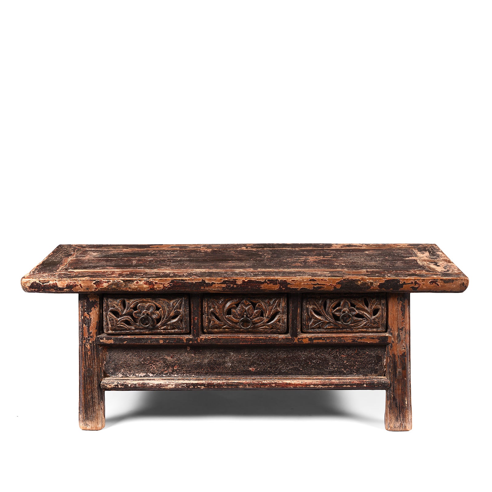 This kang table is from Shanxi province and dates from the late 19th century. Kang tables were used on either side of the kang, a raised stone platform in wealthy Chinese homes used as a bed. Traditionally the kang was heated in winter. The original black lacquer & paintwork still remains and it has beautiful floral carvings