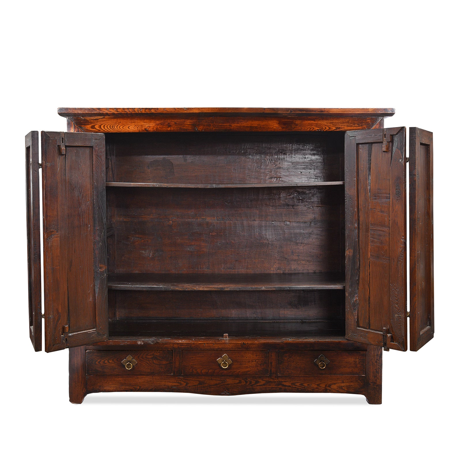 This original piece was constructed from walnut in Gansu province and is over 100 years old. Its good depth makes it perfect for a wardrobe. The four doors open fully and can be sealed with traditional wooden pegs. With 3 drawers at the base as well as the main storage area, this is a very functional piece of furniture.