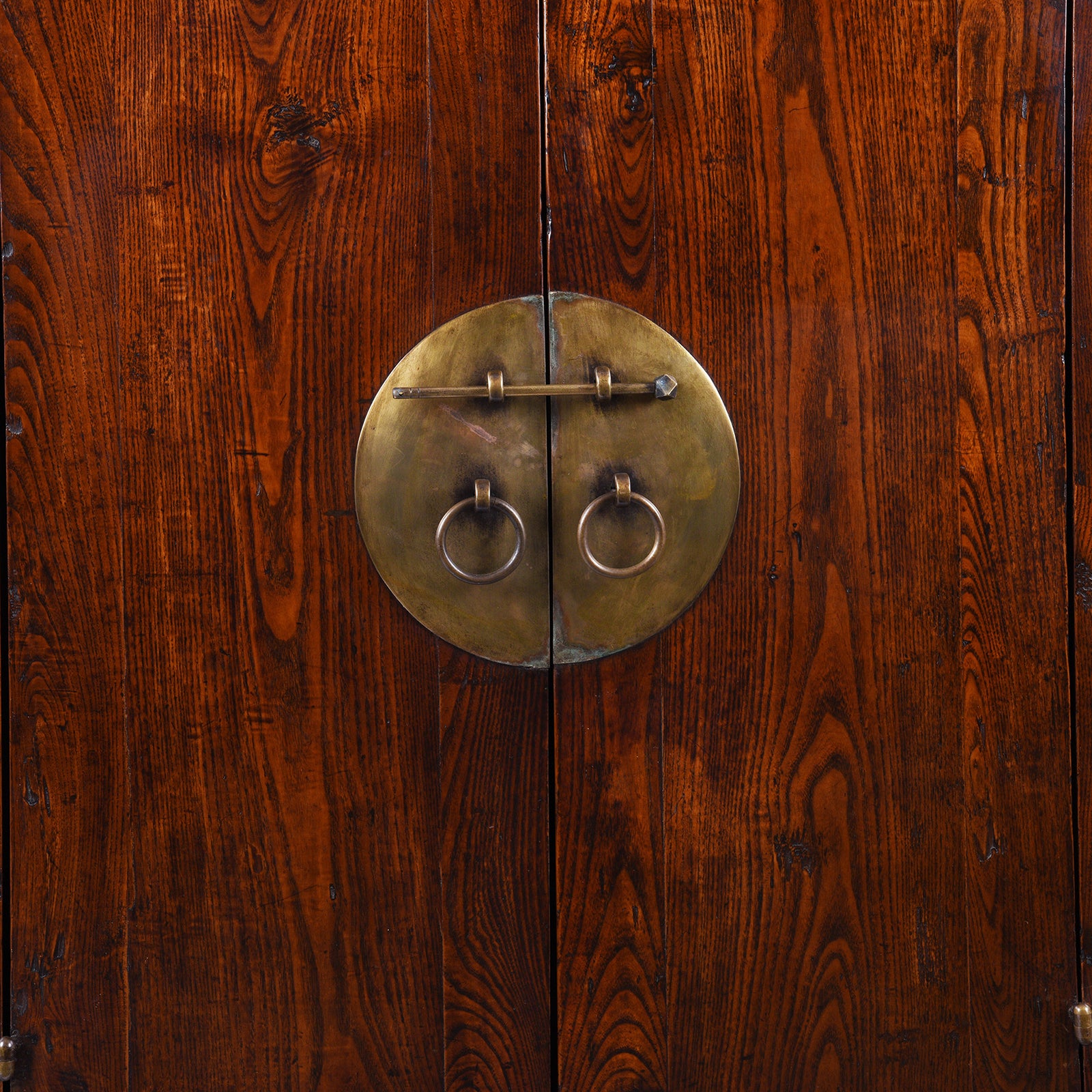 This 19th century wardrobe cabinet from Gansu is the perfect addition to any home. The refined Northern elm wood offers an elegant look, making it easy to match with a range of decor styles. Crafted in China using traditional manufacturing techniques, this large antique cabinet is sure to make a statement. One of the previous owners has reduced the height of the legs.
