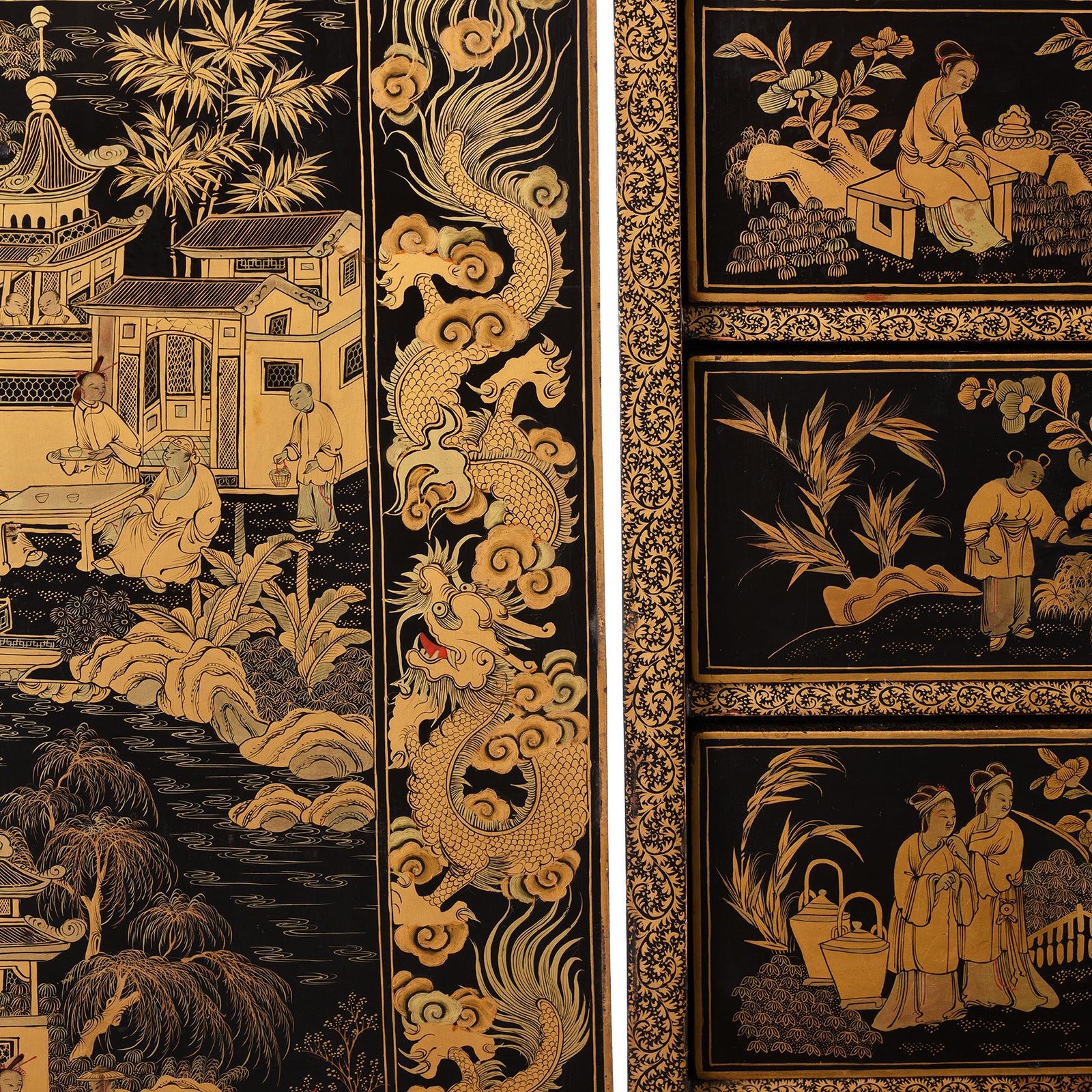 Side detail from a Gilt black lacquer Chinese export chinoiserie table cabinet. Antique & made in Canton. Similar to examples found in the Peabody Essex Museum. Exceptional quality | Indigo Antiques
