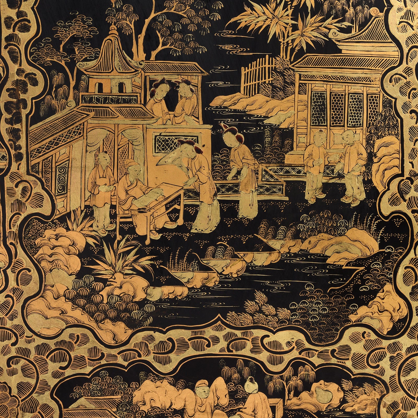Chinese figure and painting detail from a Gilt black lacquer Chinese export chinoiserie table cabinet. Antique & made in Canton. Similar to examples found in the Peabody Essex Museum. Exceptional quality | Indigo Antiques
