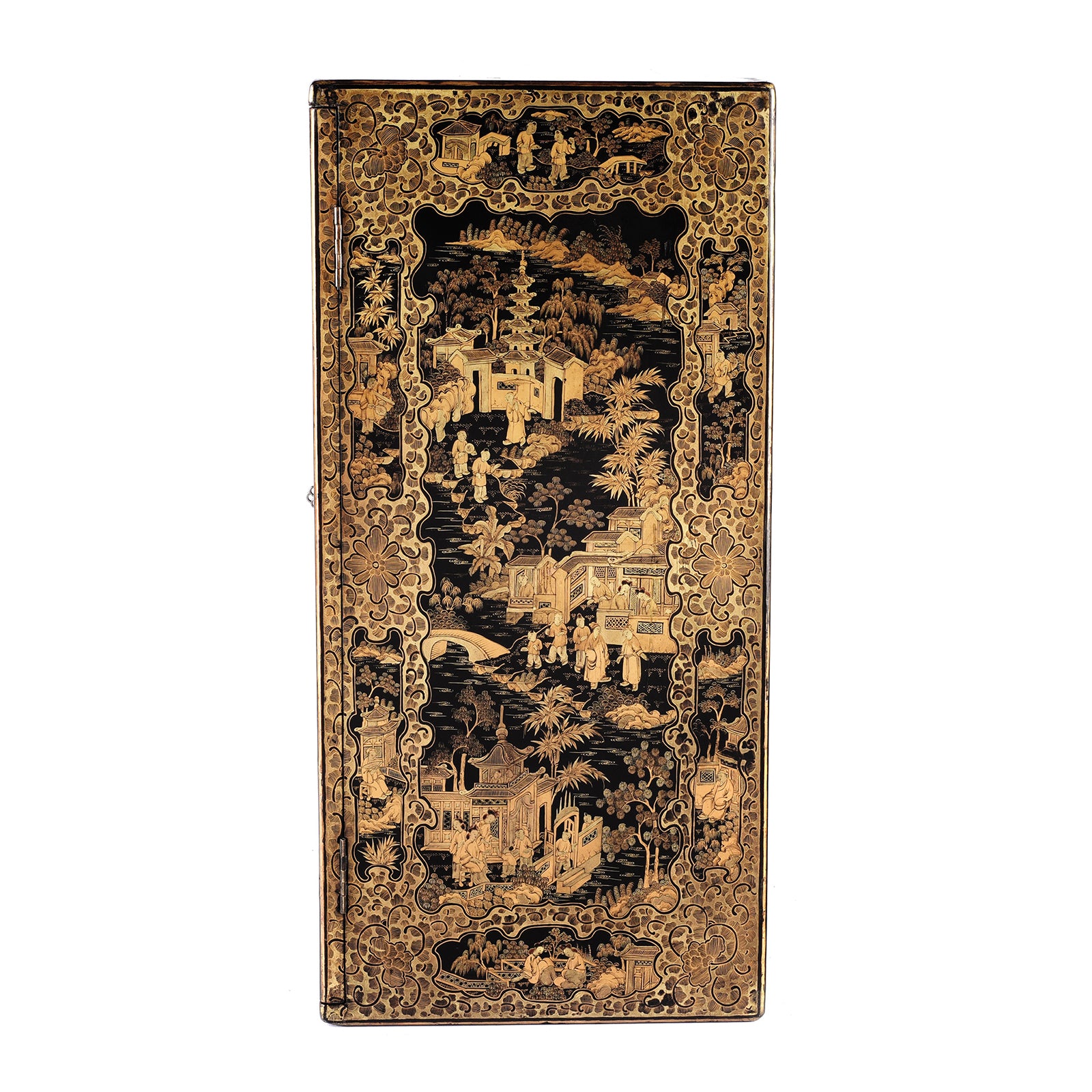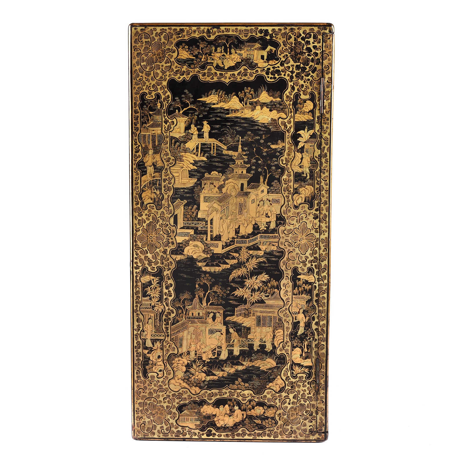 Cabinet front on a Gilt black lacquer Chinese export chinoiserie table cabinet. Antique & made in Canton. Similar to examples found in the Peabody Essex Museum. Exceptional quality | Indigo Antiques