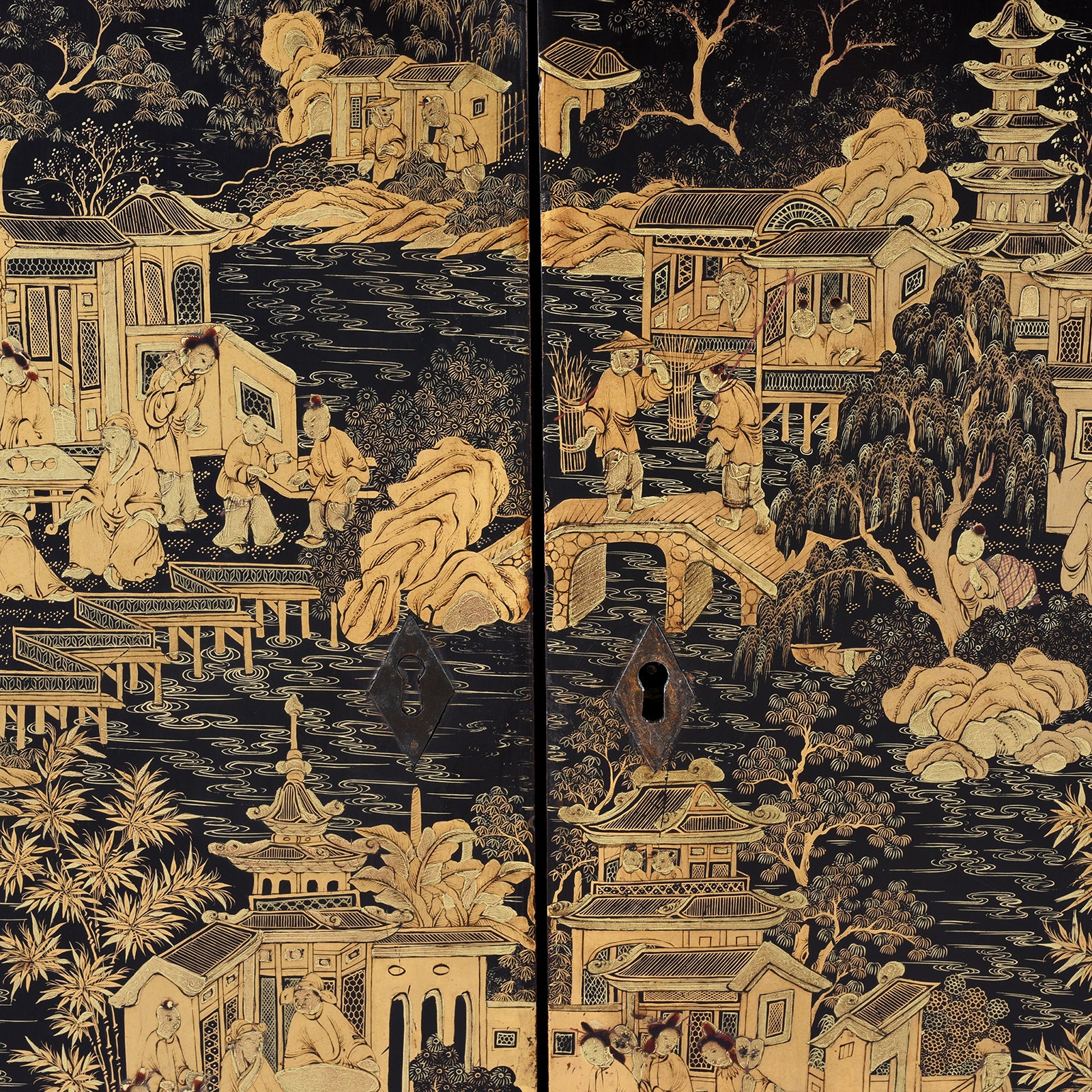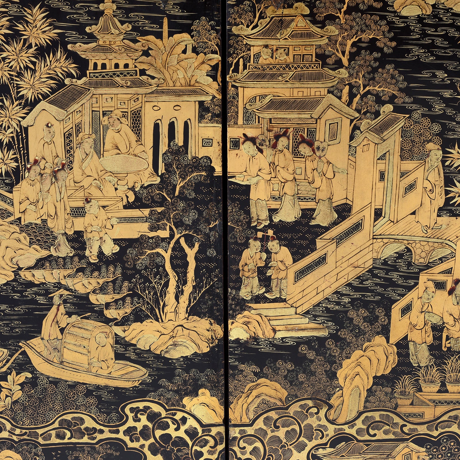 Chinese figure detail from a Gilt black lacquer Chinese export chinoiserie table cabinet. Antique & made in Canton. Similar to examples found in the Peabody Essex Museum. Exceptional quality | Indigo Antiques