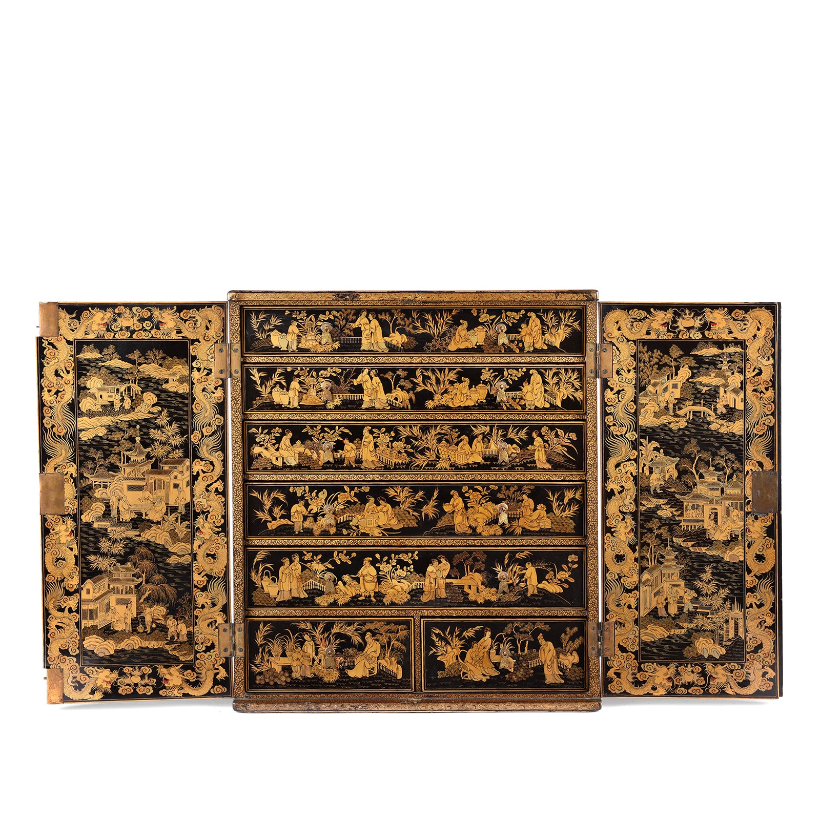 The craftsmanship is excellent with almost no wear. Our team carried out minimal repairs to the corners which are near invisible. The exterior shows scenes of daily life in China and upon opening the doors, children dressed as dragons can be seen parading through the streets. Even the tops of the drawers are covered in gilt work.