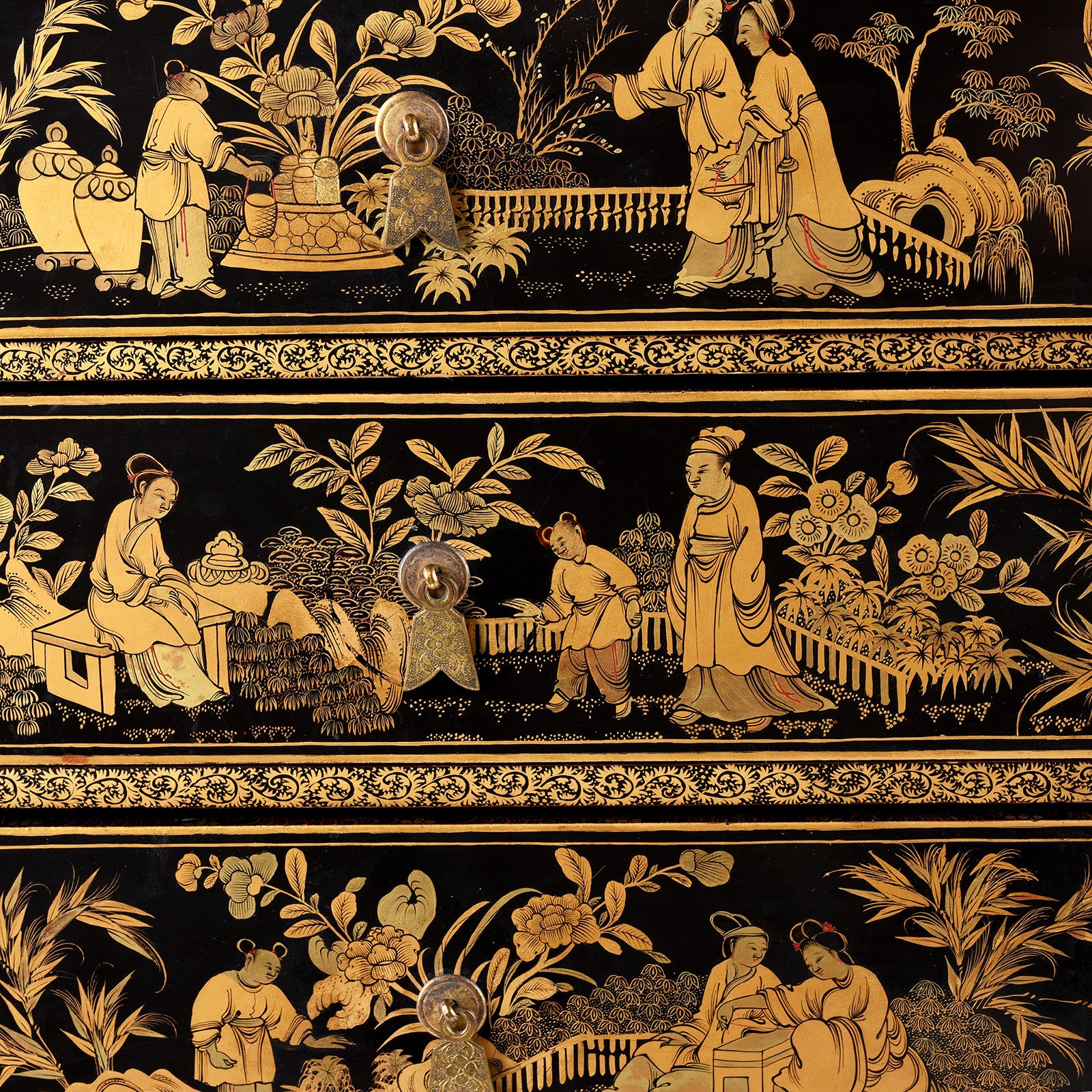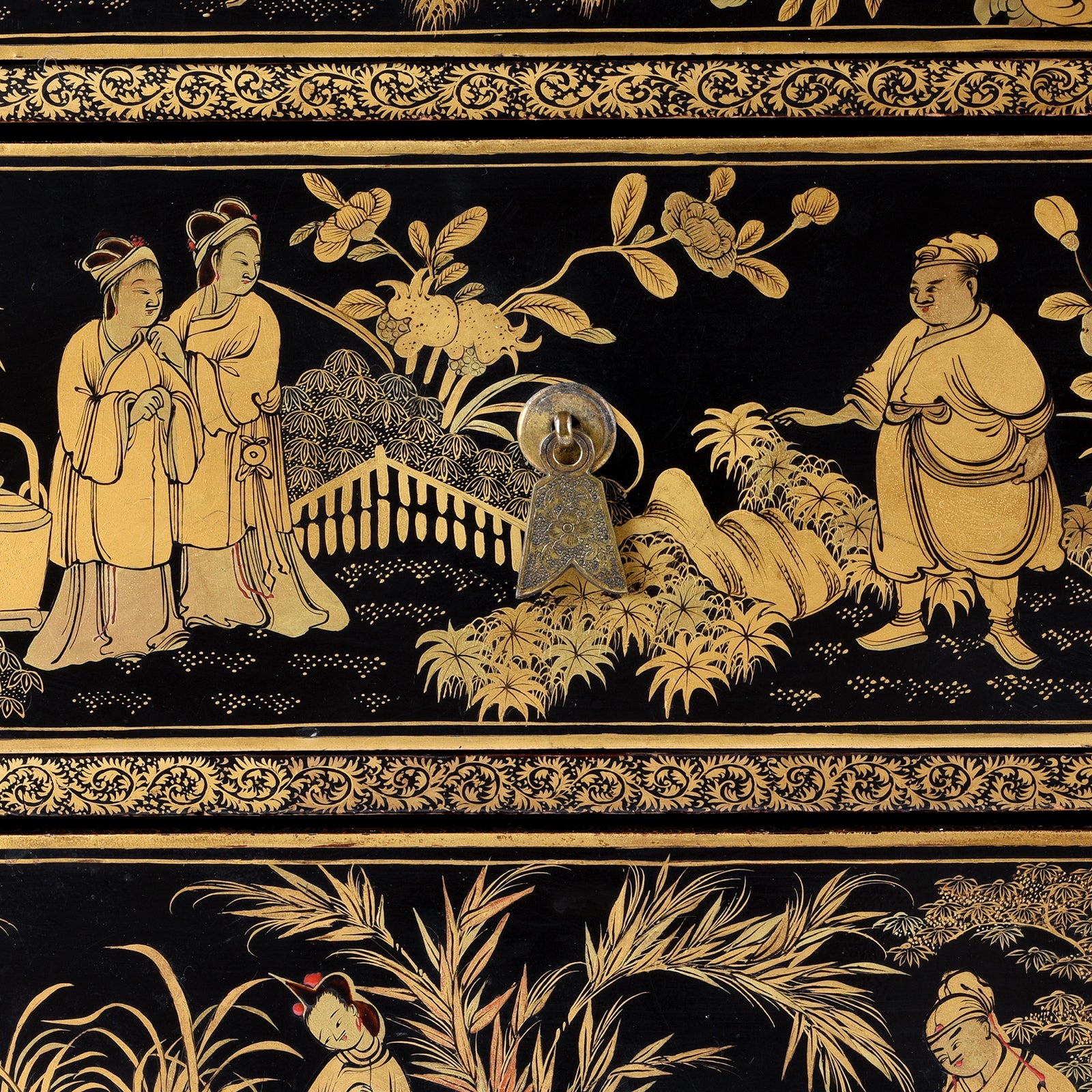 Drawer detail from a Gilt black lacquer Chinese export chinoiserie table cabinet. Antique & made in Canton. Similar to examples found in the Peabody Essex Museum. Exceptional quality | Indigo Antiques