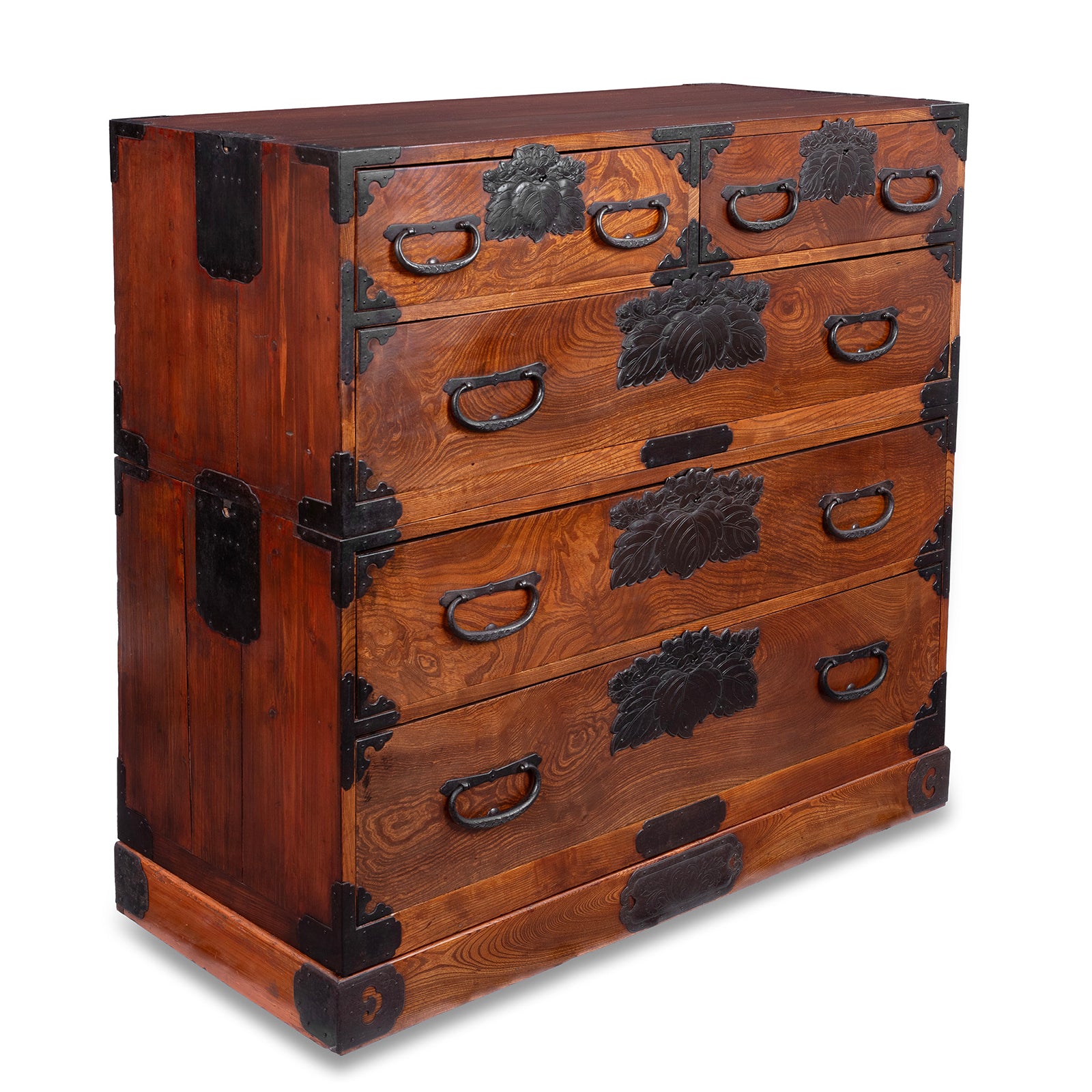 This finely crafted kasane isho dansu (stacking clothing chest) originates from Sakata, a prosperous port town in northern Japan known for its merchant wealth and distinctive cabinetry traditions. Made in the late 19th century from richly grained keyaki (Japanese zelkova, 榉木), it shows dramatic swirling patterns across the drawer fronts. The bold iron mounts, including layered chrysanthemum lock plates and protective corner fittings, exemplify Meiji-period metalworking. In Japanese symbolism, the chrysanthemum represents longevity, renewal, and the Imperial household.