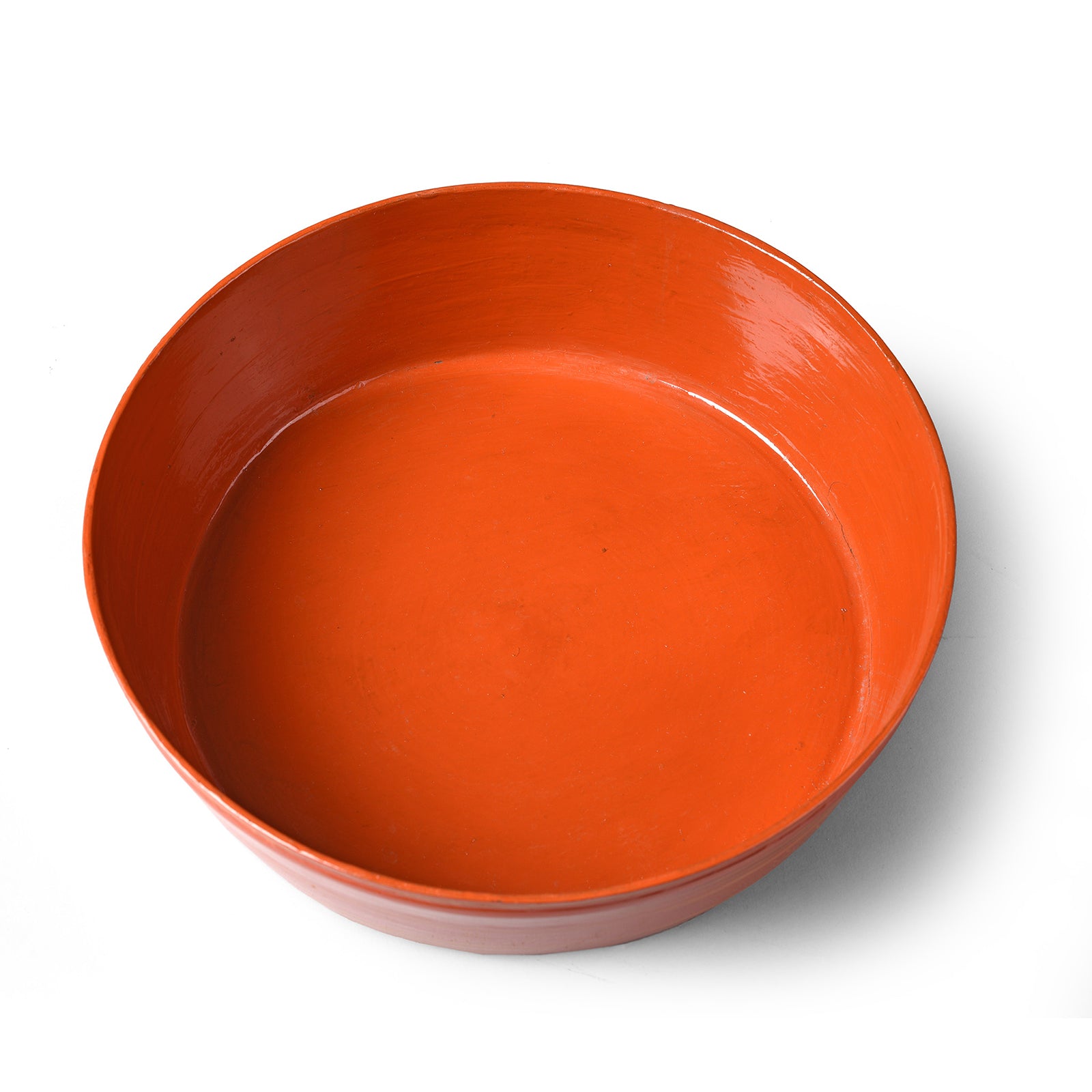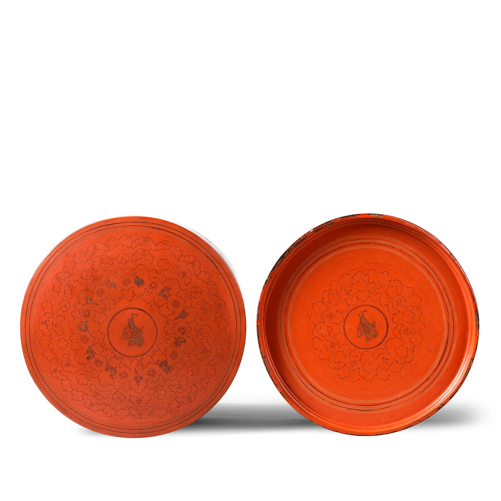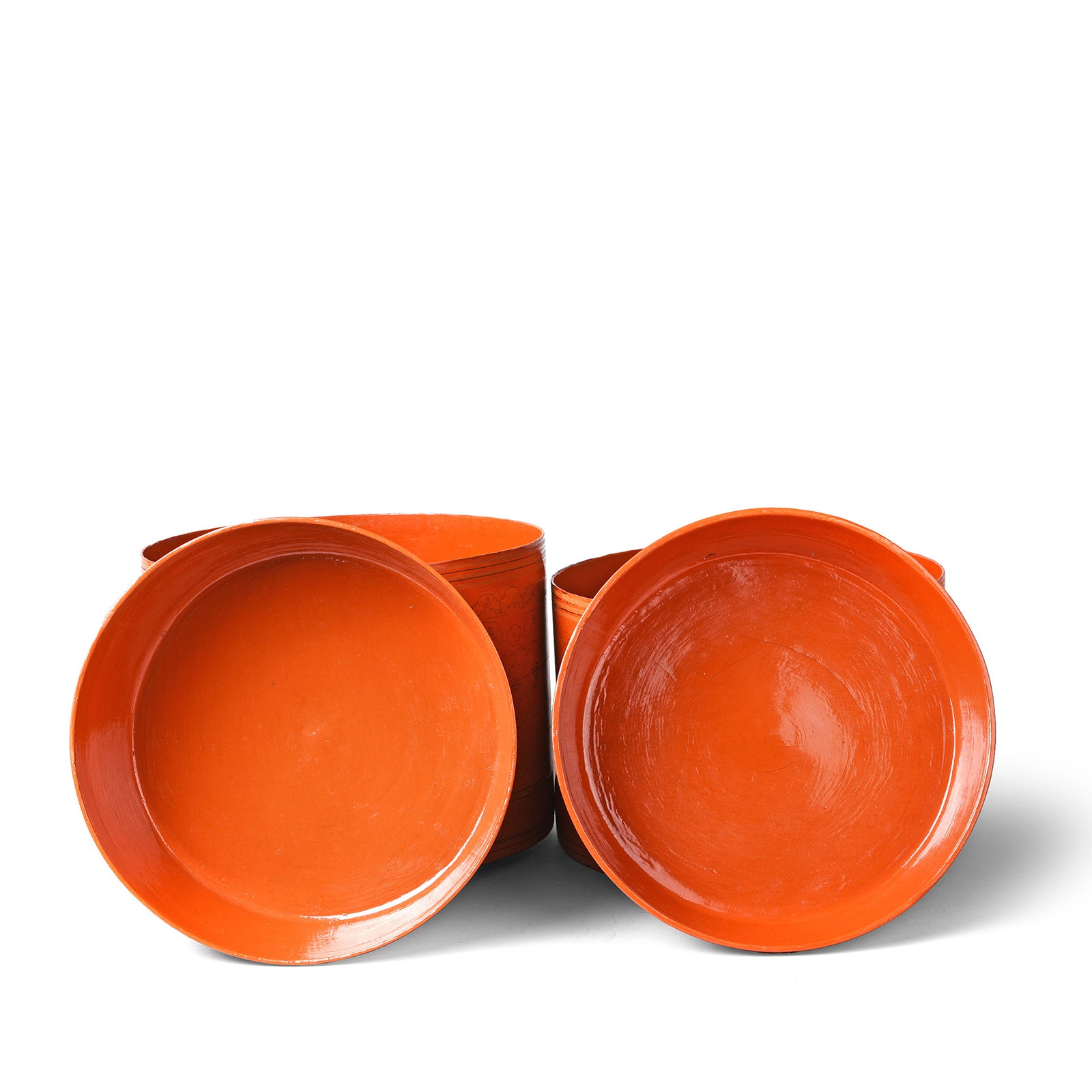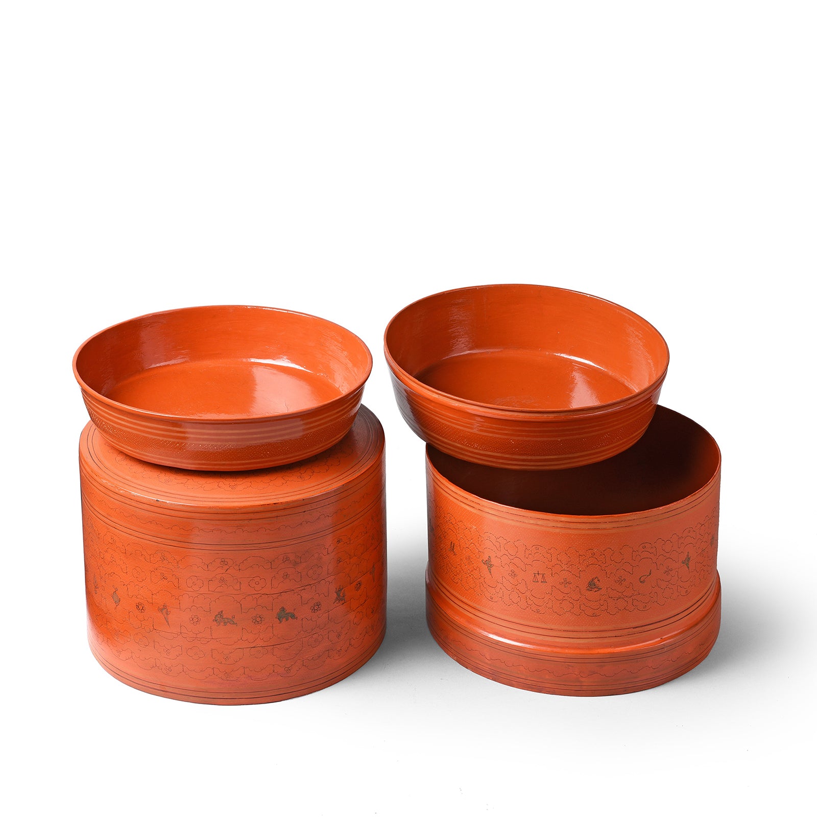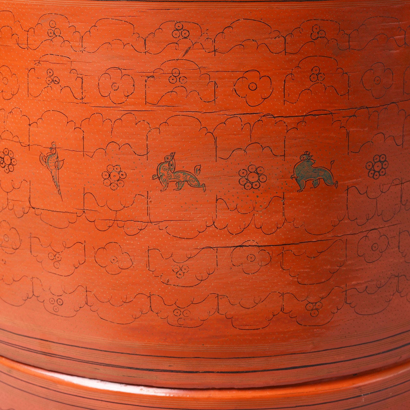 Large Burmese lacquerware betel box (kun it) orange lacquer tiffin box with kunan kanbyat etching| Indigo Antiques
