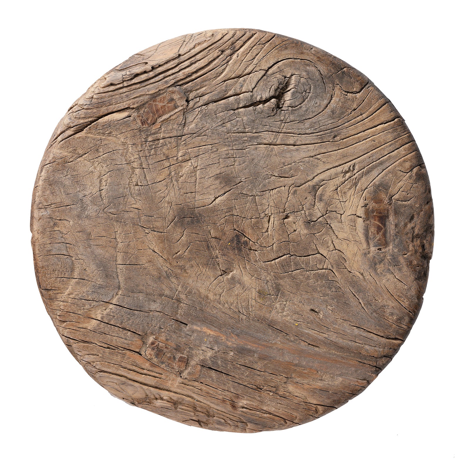 This three-legged farmer's milking stool from Shanxi province dates to around 1900. Handcrafted in elm, it has a thick, round seat supported by tapered legs joined with simple stretchers for stability. The seat's surface shows the distinctive wear and markings of long-term use, while the wood retains a darkened patina from decades of handling.