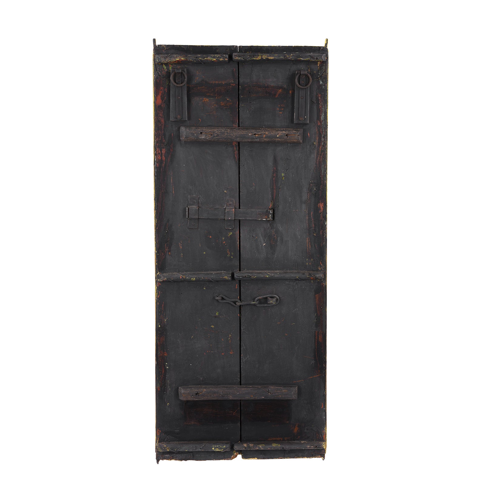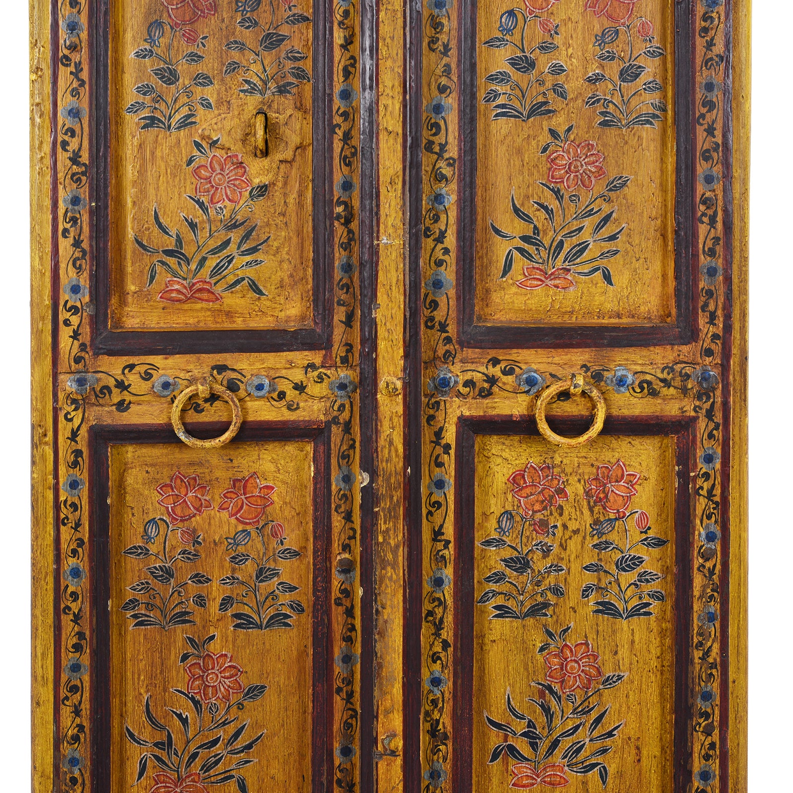 These striking Indian doors have been hand painted using traditional Indian techniques and colours in the Mughal style. The doors themselves are old while the paintwork is new. Flowers and detailed spiralling foliage sit on a vibrant yellow background. Perfect to add a splash of colour to any room or hallway. Supplied with sturdy hangers.