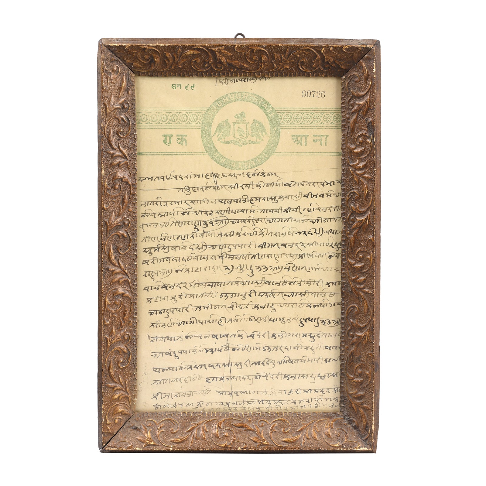 This old Indian loan from Northern India is a unique talking point and perfectly suited for a bathroom or hallway for some interesting and unusual wall art. The loan is to a citizen of Jodhpur city in Rajasthan, and supplied in an old frame and a hanging loop at the top.