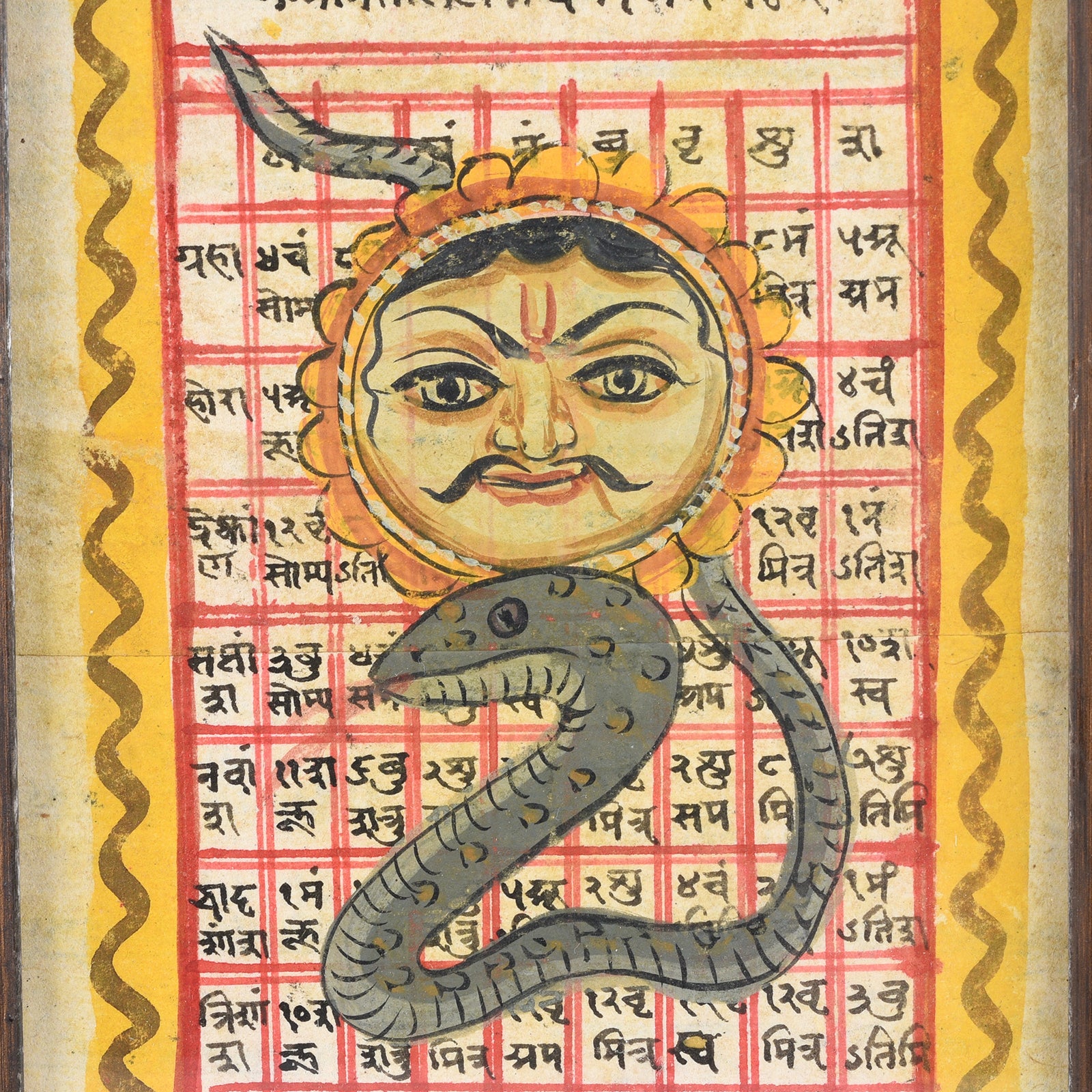 The first is an image of Surya - the Sun deity - coiled by a serpent that likely signifies the shadow planets Rahu or Ketu. Above, a star-mandala, a mantra grid, Together, these elements form a devotional-astrological talisman intended to harmonise difficult planetary influences. The top inscription reads Graha Shanti Yantra (ग्रह शांति यंत्र), identifying its function as a charm to pacify the planets. Below, a protective line invokes divine aid, and the chequered table is filled with bīja syllables (seed mantras) for meditative recitation. The Sun's face represents vitality and auspicious light, while the serpent alludes to eclipse forces that the yantra seeks to neutralise.
