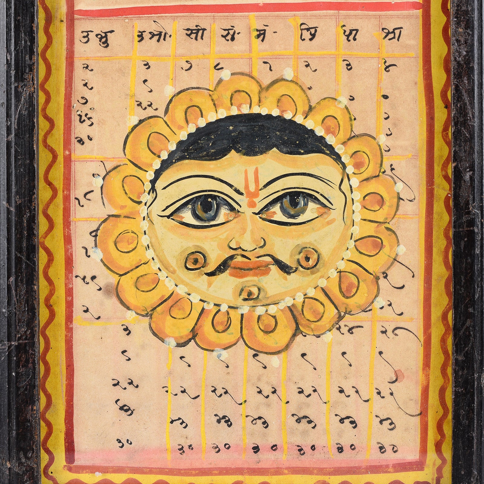 This hand-painted Surya yantra combines a radiant sun-face, a lotus-wheel of seed syllables, and a calculation grid used in folk astrology. The multi-petalled diagram carries Devanagari letters as bīja sounds, and the short invocation reads "Ādityāya namaḥ -Salutations to the Sun-god". The lower table repeats vowels and numerals in a simple horoscopic chart, while the wide-eyed face of Surya anchors the piece for daily contemplation. Such paintings were traditionally hung to balance the horoscope and invite the Sun's auspicious light.