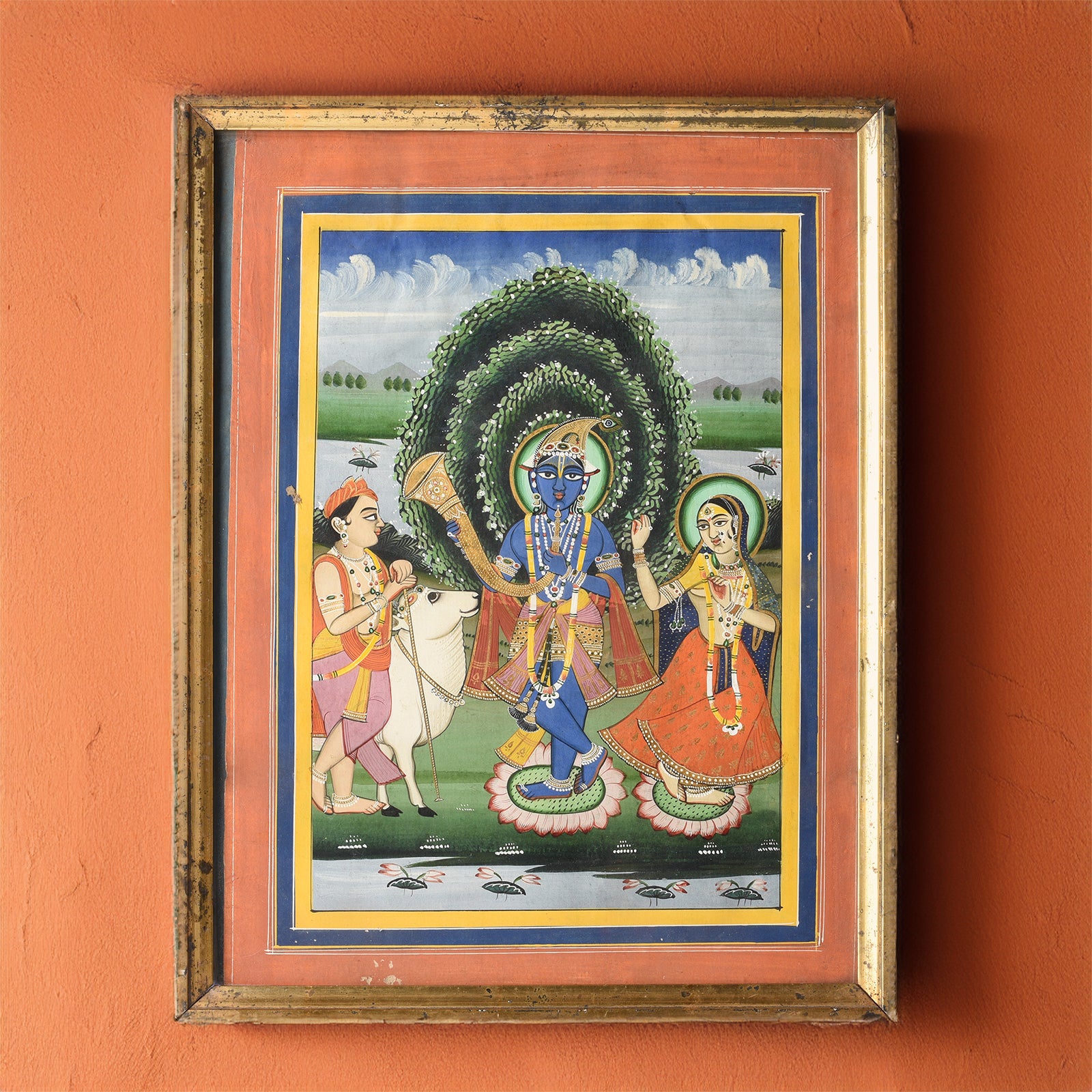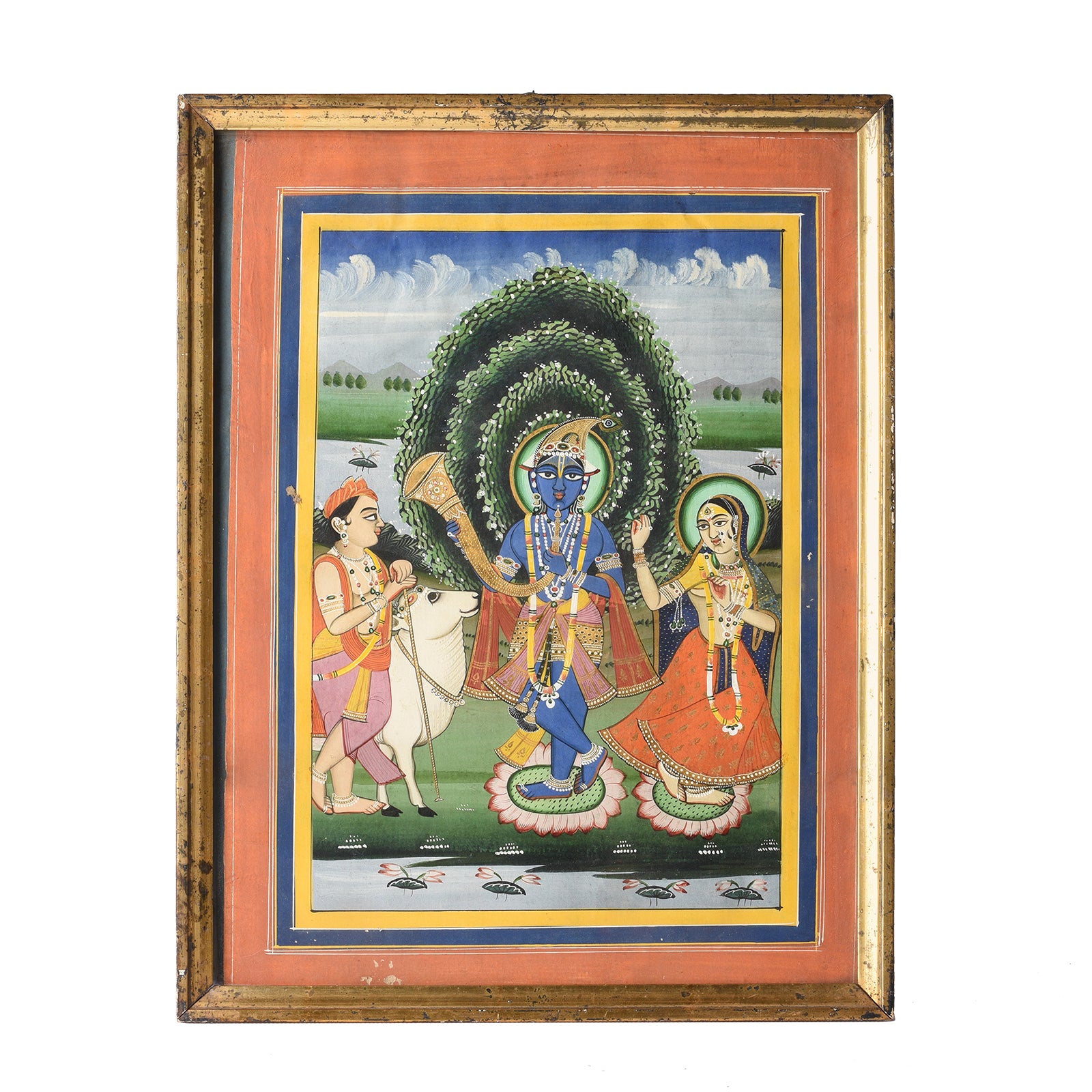 This Bikaner school Indian watercolour depicts Krishna playing a horn to Radha in the company of a cow handler with his cow. Krishna and Radha stand on lotus leaves near a lake while clouds and mountains dominate the background.