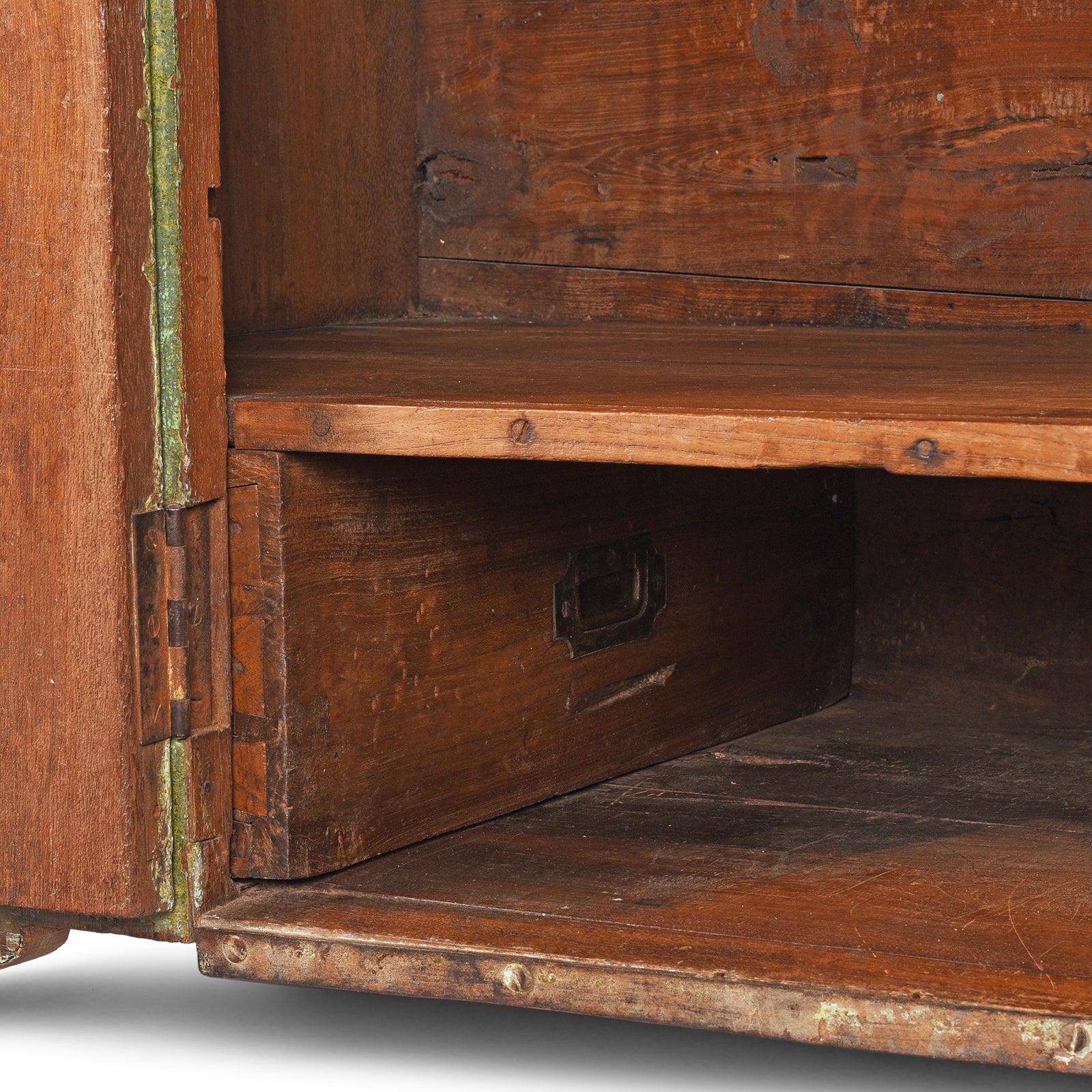 Interior Compartment Detail From Antique Front Opening Indian Green Painted Teak Military Chest | Indigo Antiques