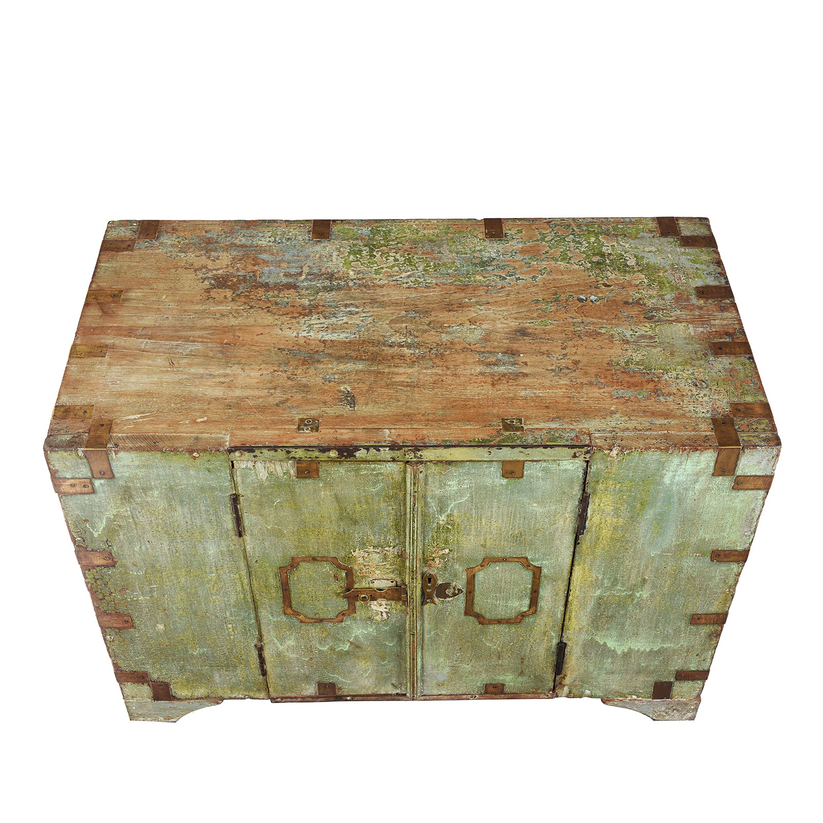 Top Down View Of Antique Front Opening Indian Green Painted Teak Military Chest | Indigo Antiques