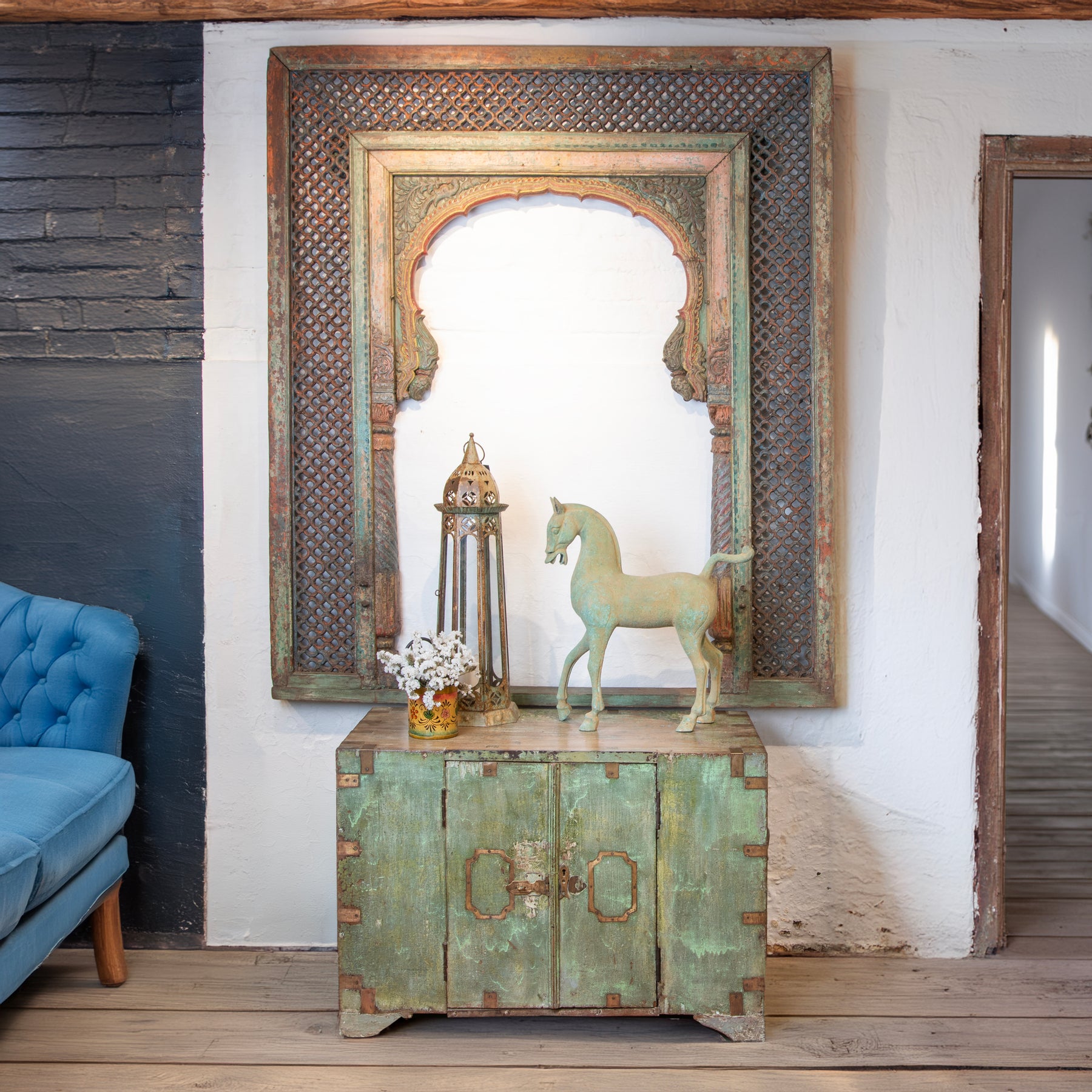 Lifestyle Exapmle Of Antique Front Opening Indian Green Painted Teak Military Chest | Indigo Antiques