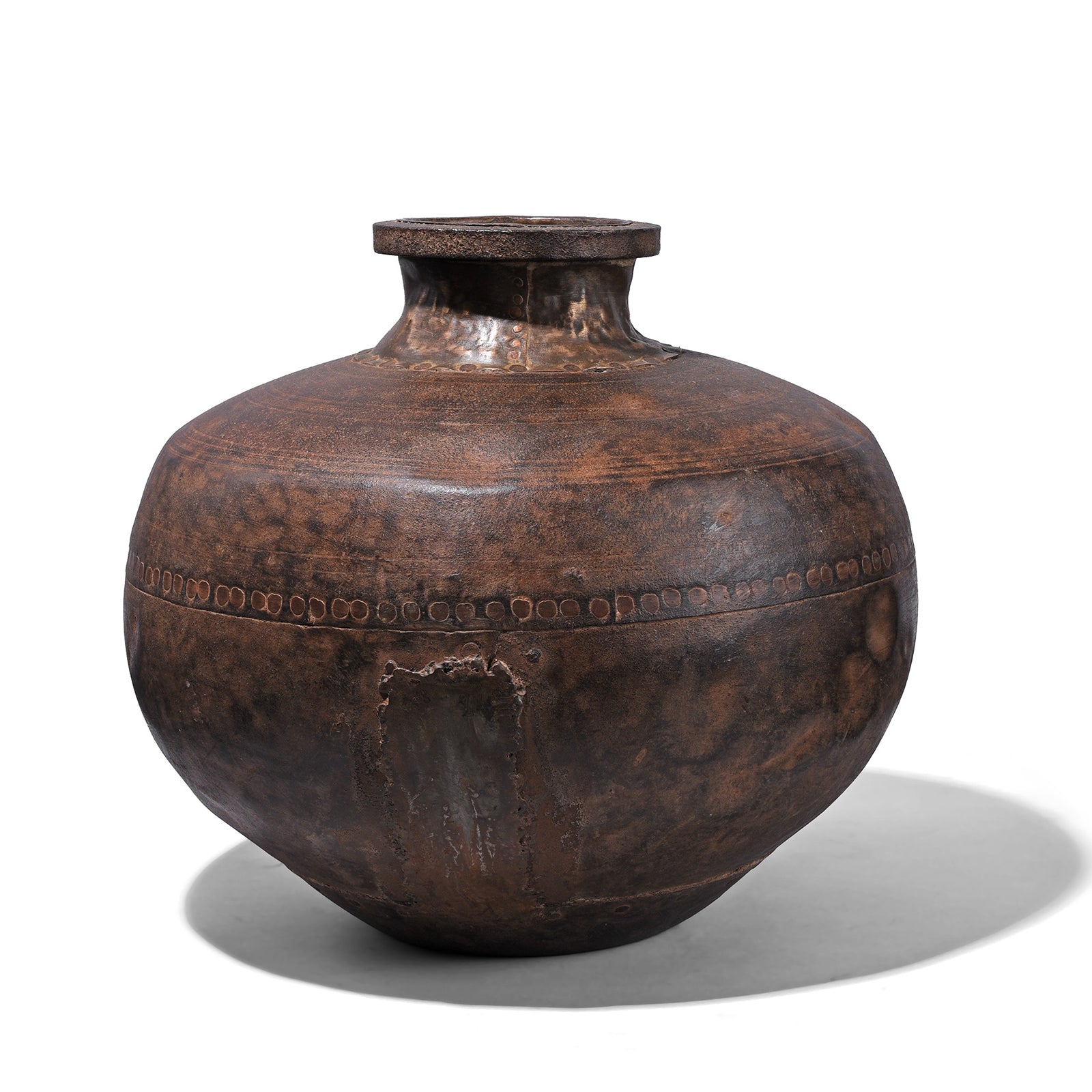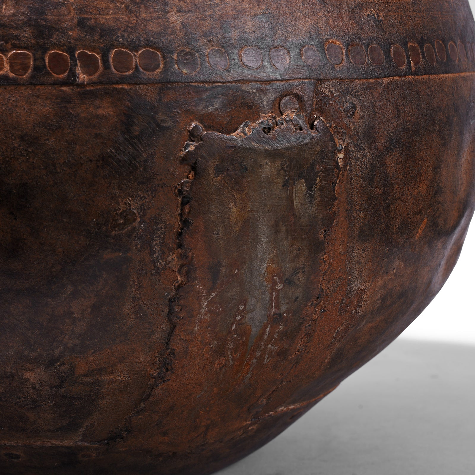 The rounded form is crafted from iron and finished with a dark, mottled surface that shows areas of wear from decades of use. A simple decorative band of stamped circular motifs runs around the body, adding subtle ornamentation to an otherwise purely functional vessel. Lota pots are perhaps most iconically associated with the graceful sight of women, and sometimes children, balancing them on their heads while gathering water, often accompanied by conversation and community interaction along the way. Today, this piece serves as a sculptural reminder of traditional domestic practices and rural life.