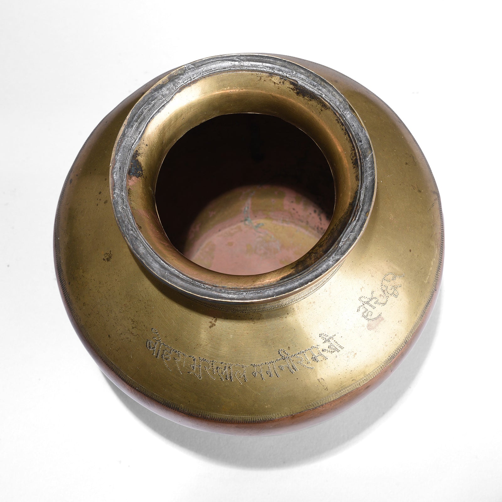 Around the vessel's shoulder, an inscription in finely punched Devanagari script reads: "गंगा जमुना पवित्र पानी" - "Sacred Water of the Ganga and Jamuna" and "हरिद्वार" - "Haridwar". These words confirm its purpose: to safeguard holy water gathered during pilgrimage, water believed to cleanse the soul and bless the home.