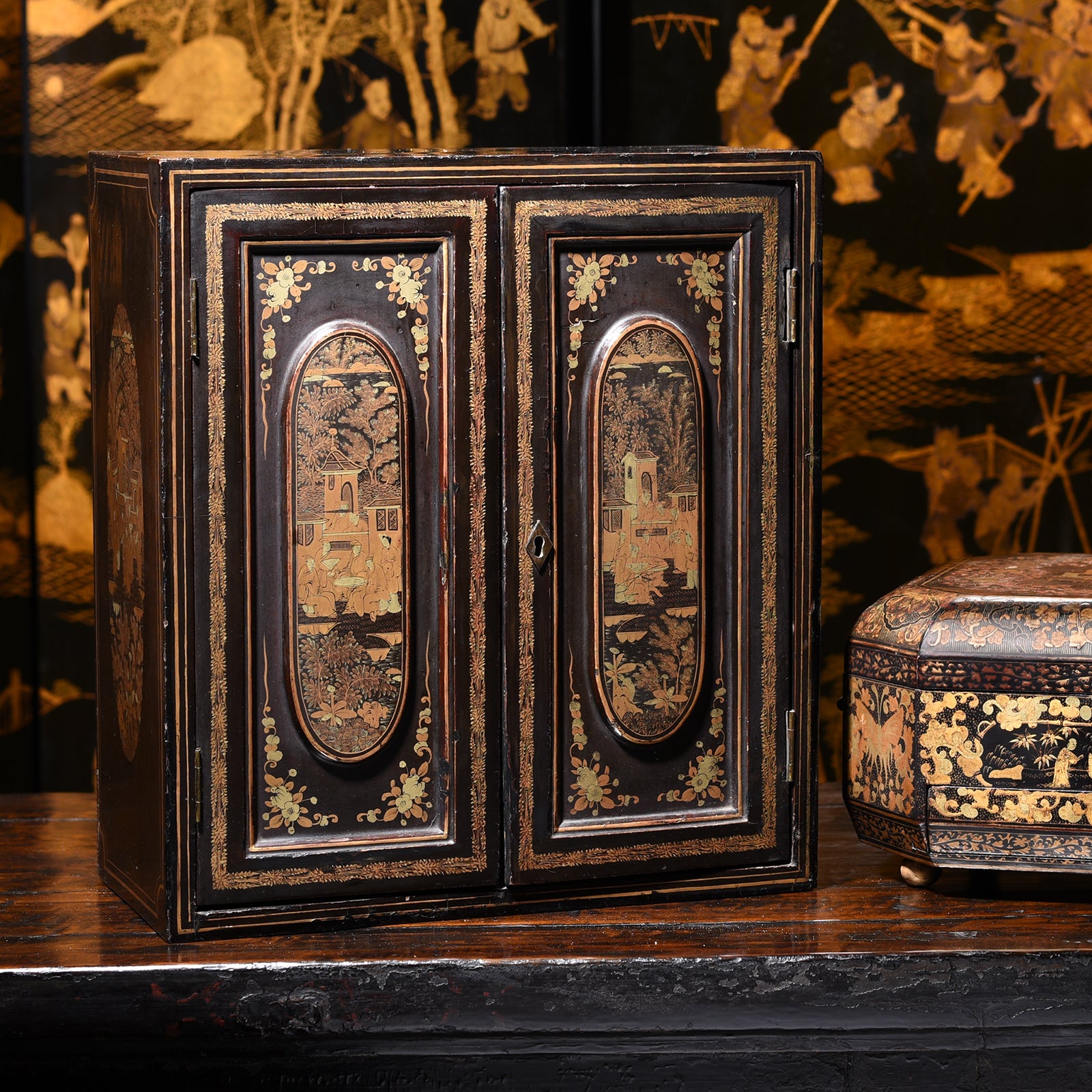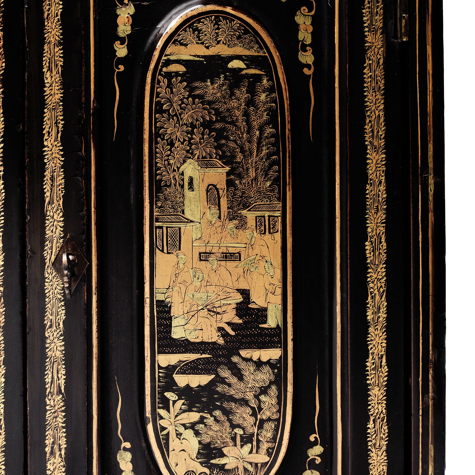 Key Detail From Antique Gilt Black Lacquer Chinoiserie Export Jewellery Cabinet - 18th Century | Indigo Antiques