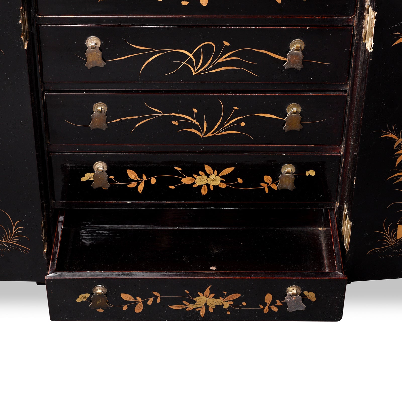 Drawer Detail From Antique Gilt Black Lacquer Chinoiserie Export Jewellery Cabinet - 18th Century | Indigo Antiques