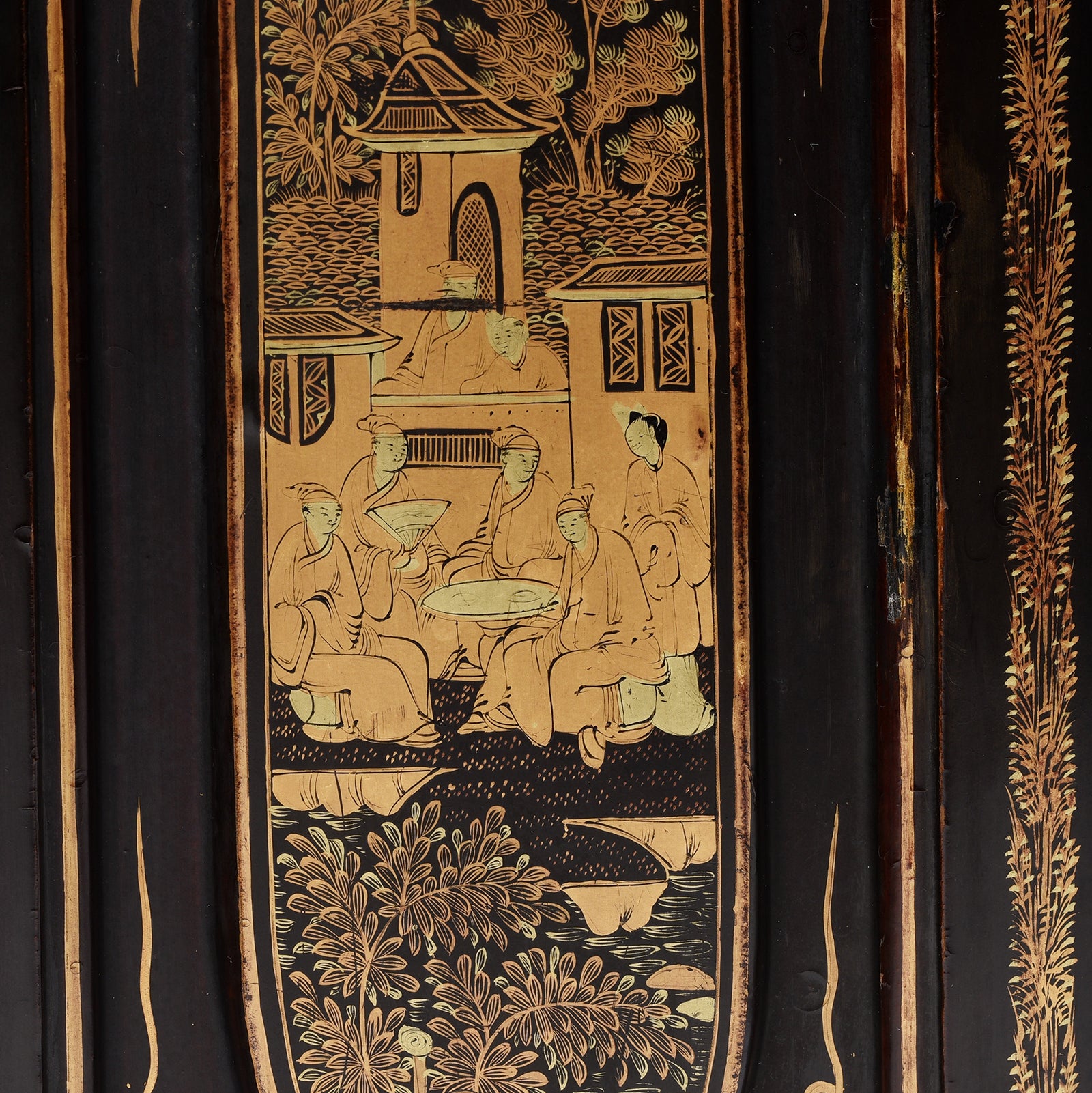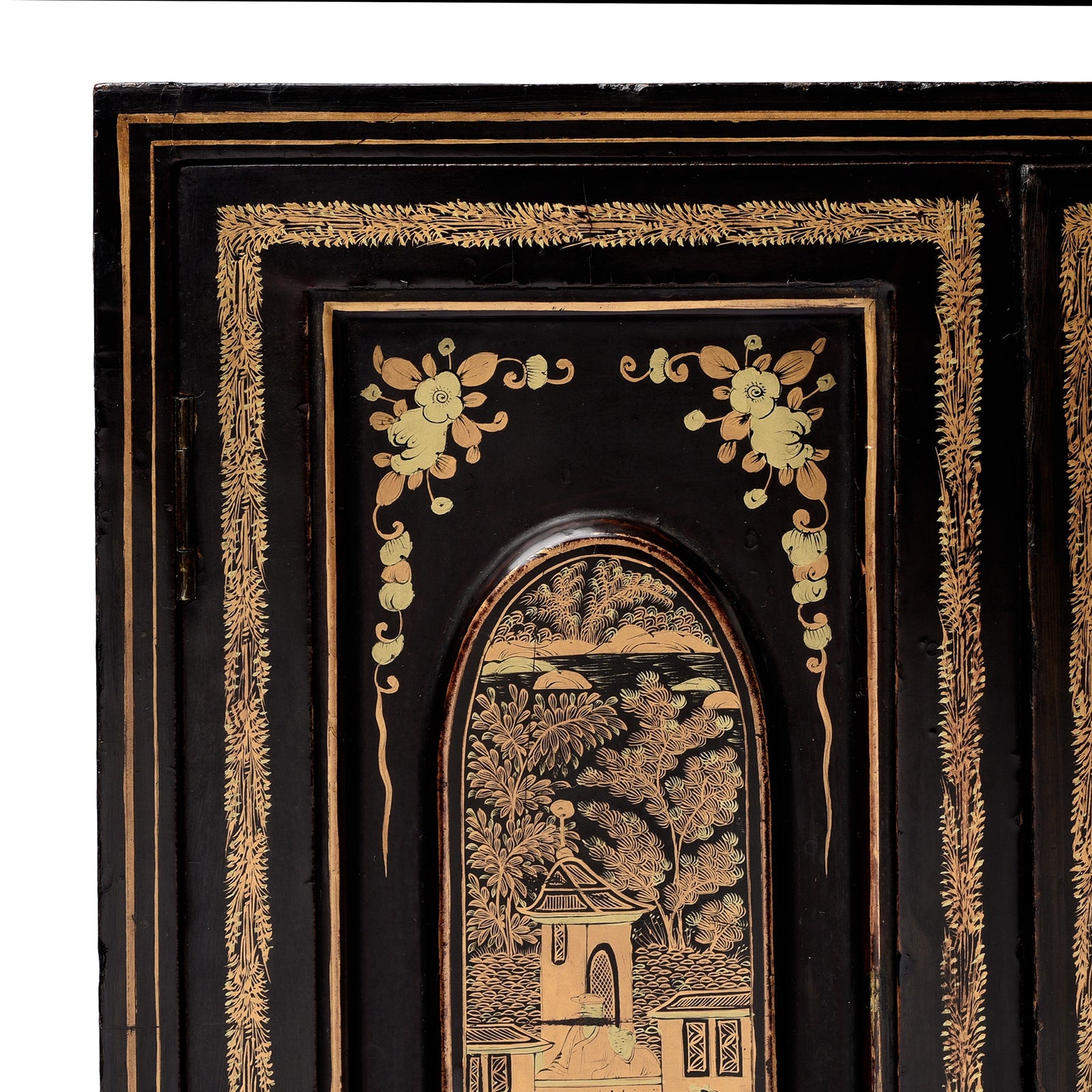 Doors Detail From Antique Gilt Black Lacquer Chinoiserie Export Jewellery Cabinet - 18th Century | Indigo Antiques