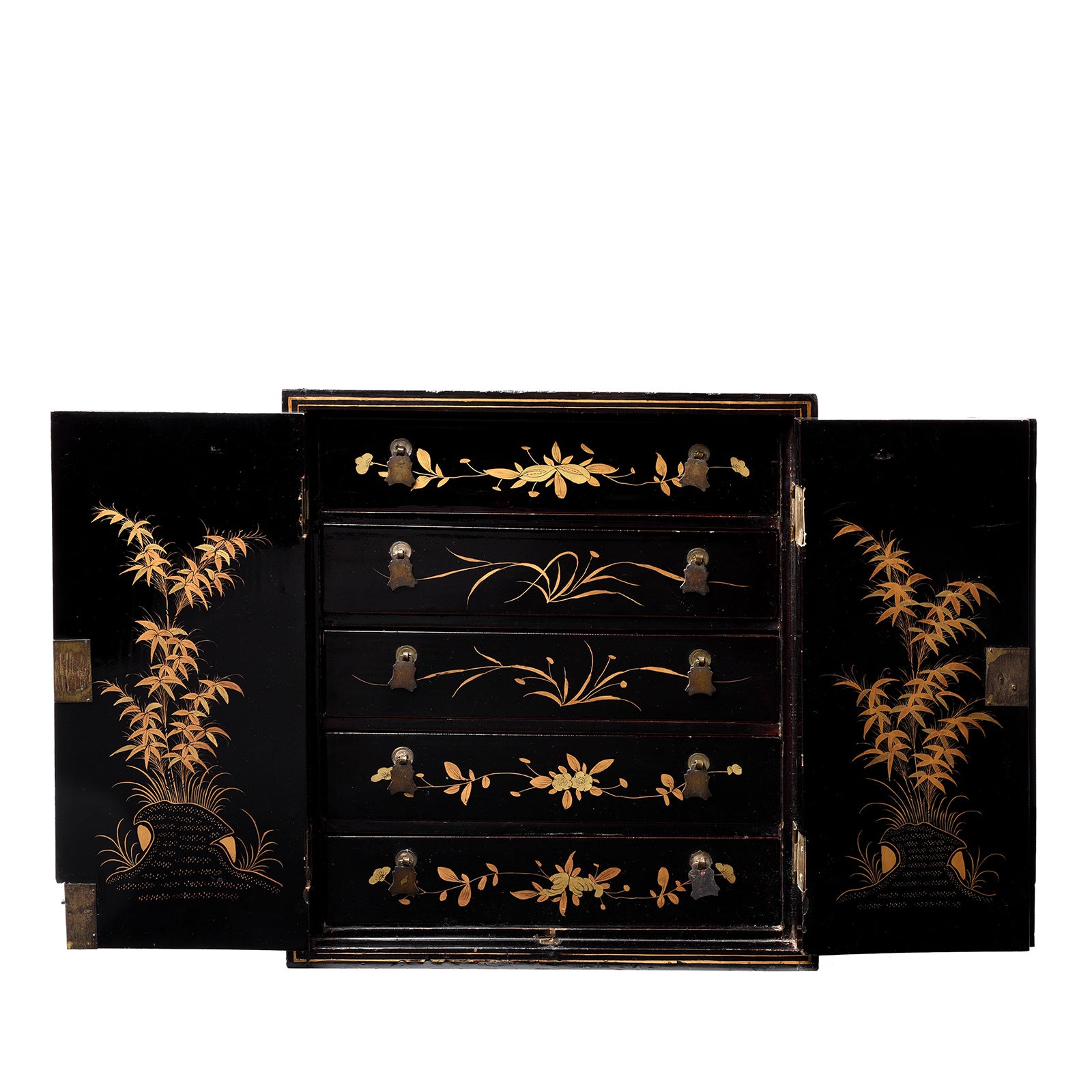 Antique Gilt Black Lacquer Chinoiserie Export Jewellery Cabinet - 18th Century | Indigo Antiques