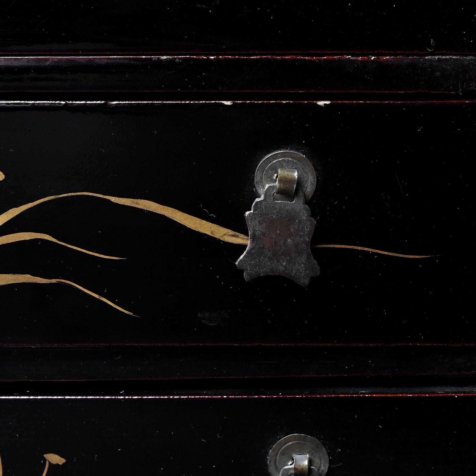 Handle Detail From Antique Gilt Black Lacquer Chinoiserie Export Jewellery Cabinet - 18th Century | Indigo Antiques