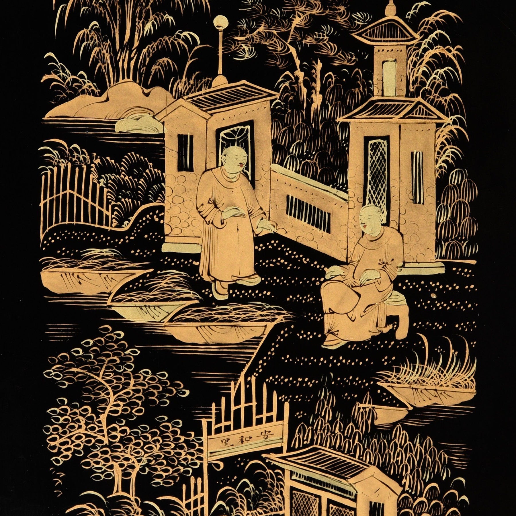 Painting detail from a Chinese Export Gilt Black Lacquer Jewellery Table Cabinet - Early 19thC | Indigo Antiques