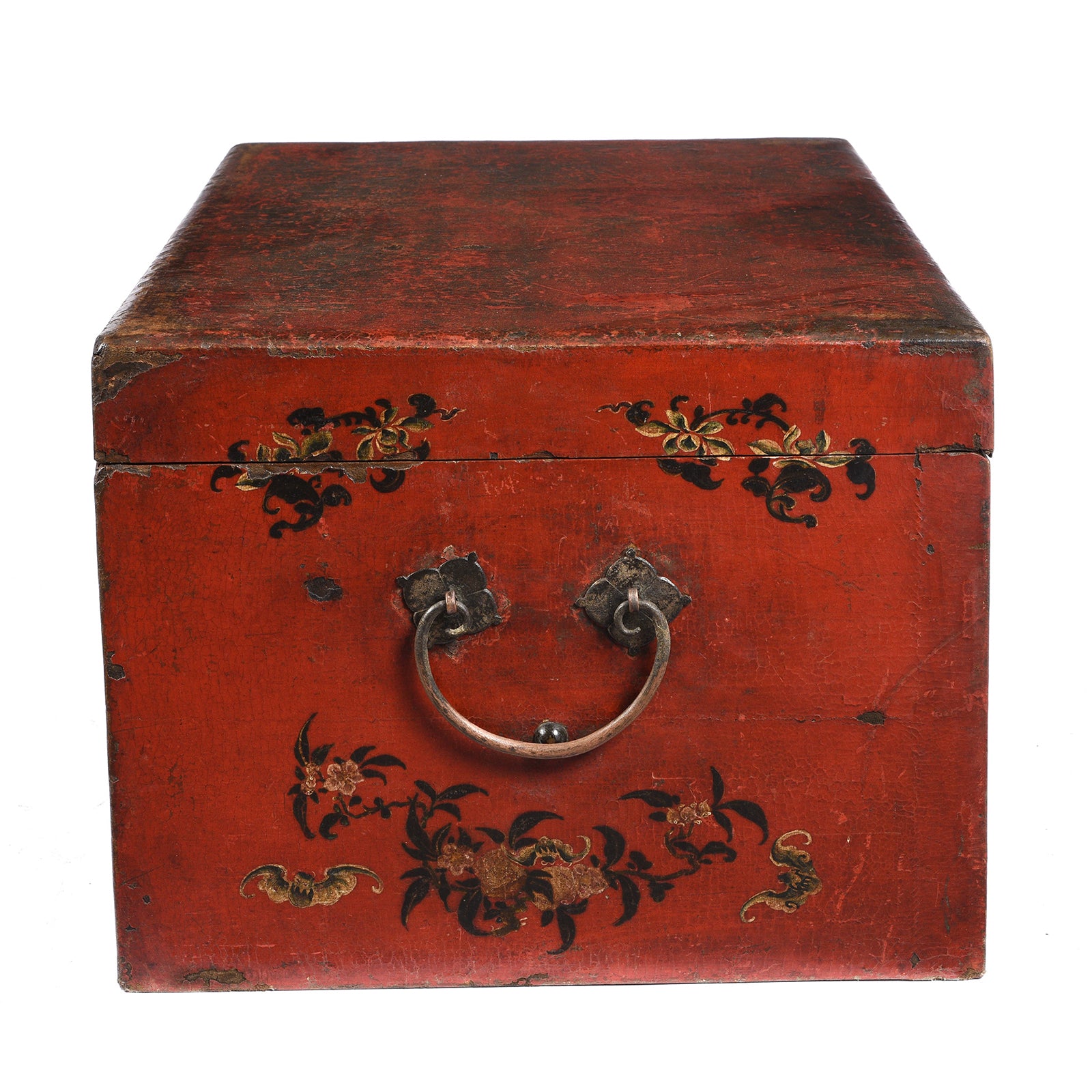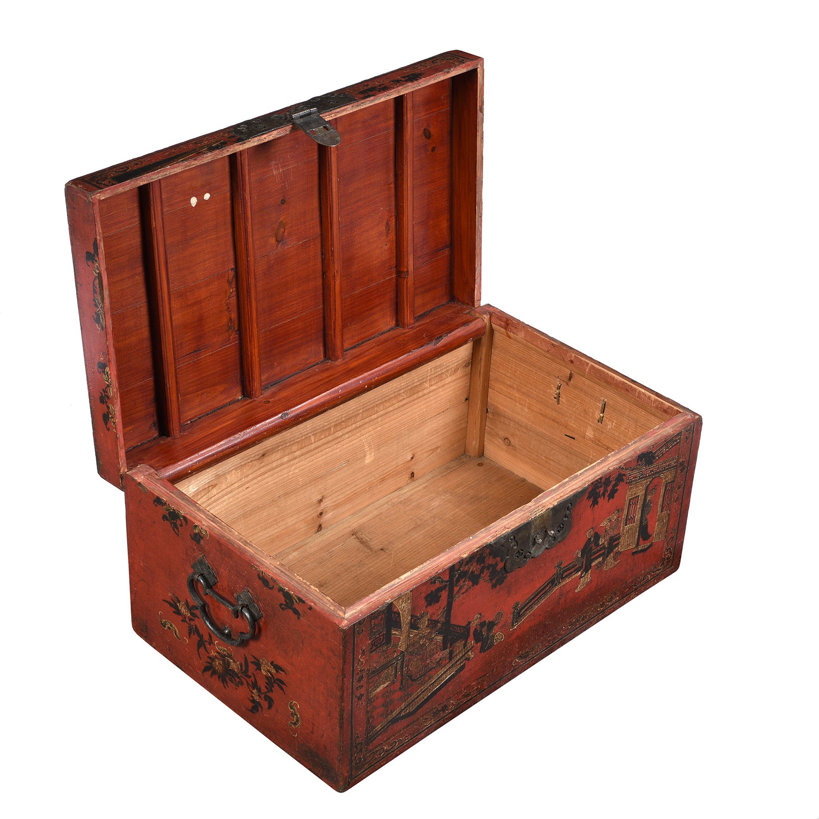 The quality of this piece is exceptional with a level of painting and gilding rarely seen now. The painting depicts traditional court scenes in Shanxi. A snapshot of life in the Ming & Qing dynasties. The sides are decorated with lucky bats. The lock plate and right handle are original to the piece and made from high quality brass with a beautiful patina. The rounded lifting handle has been replaced at a later date.