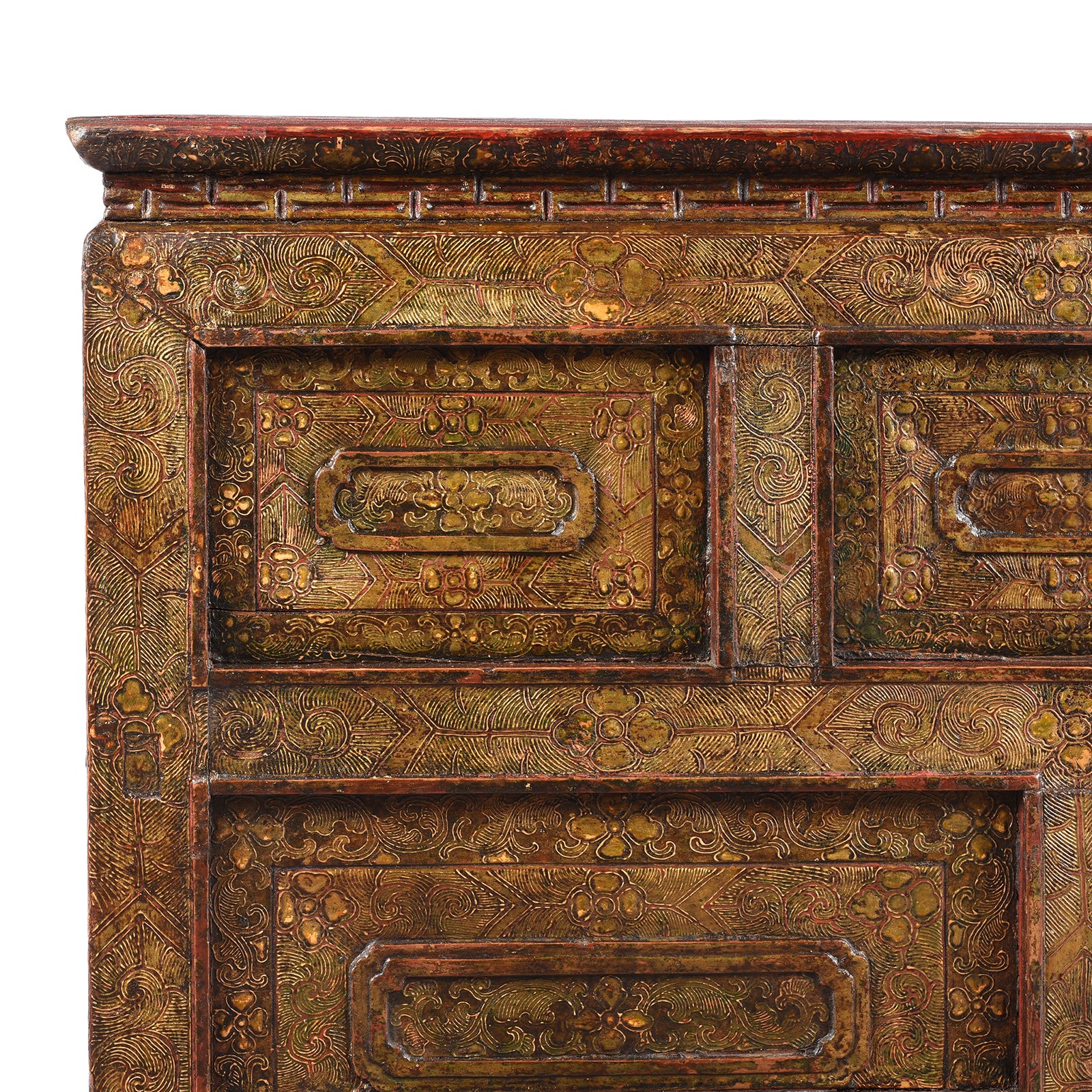 The raised gesso work is traditionally known as kyungbur. This style of gilt kyungbur is seen exclusively in Tsurpu monastery in Central Tibet, the traditional seat of the Karmapa, head of the Karma Kagyu lineage of Tibetan Buddhism. Similar examples can be found on pages 51 and 67 of Auspicious by Design by C. Corona.