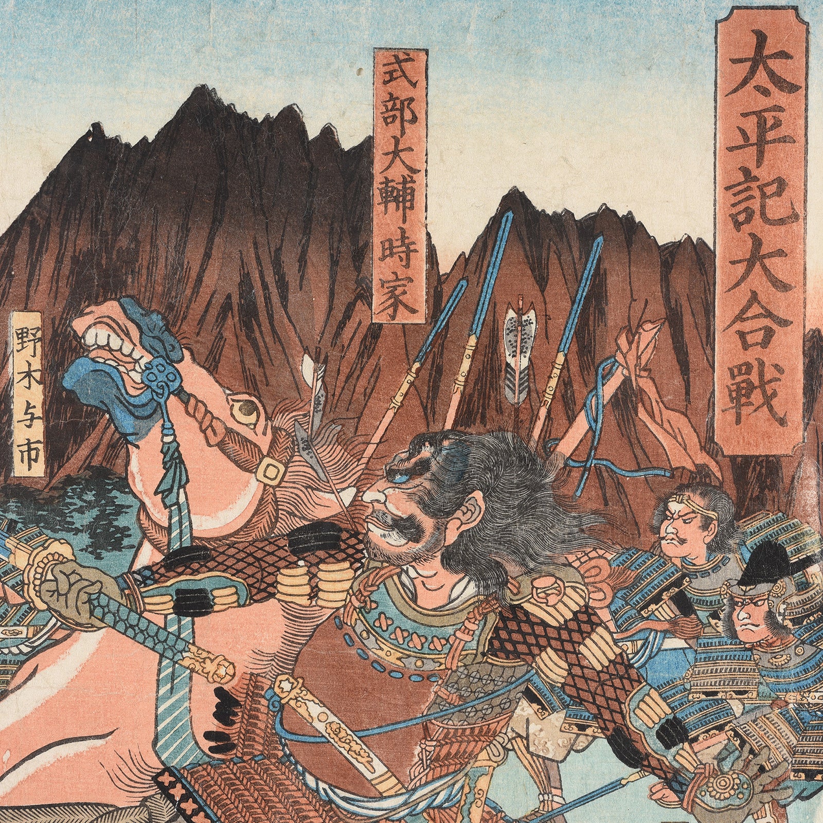 This old Japanese woodblock print is by renowned woodblock print artist Utagawa Yoshikazu and from a set of three entitled 'Great Battle of the Taiheiki' which records the battle from a famous chronicle of the warring period between Northern & Southern in 14th century Japan.